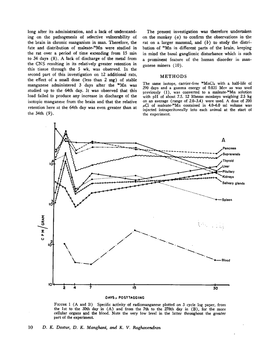 The fate and distribution of isotopic manganese administered as a single carrier-free dose of 200 μCi of maleate-54Mn to 12 rhesus monkeys was studied at different time periods from the 6th hr to the 278th day. Whole-body activity was measured, and all body organs and tissues and different parts of the central nervous system (CNS) were evaluated for specific activity, exponential analysis, and relative retention. Exponential analysis revealed a pattern of discharge with a fast and a slow component for the whole body and for many of the viscera. All parts of the CNS and, to a lesser degree, the thyroid and muscle showed an almost steady state of activity after the initial uptake. While the whole body and most organs and tissues appeared to discharge their radioactivity with the passage of time, first rapidly and then gradually, the CNS, endocrine glands, and muscle tissues showed persistent levels of specific activity. All components of the brain exhibited increasing relative retention, the lentiform nucleus and the cerebellum showing this more. It is suggested that the selective vulnerability of the brain in manganese miners might result from this inability on the part of the CNS to discharge the 54Mn with time. This investigation confirms and amplifies our earlier similar study on the rat.