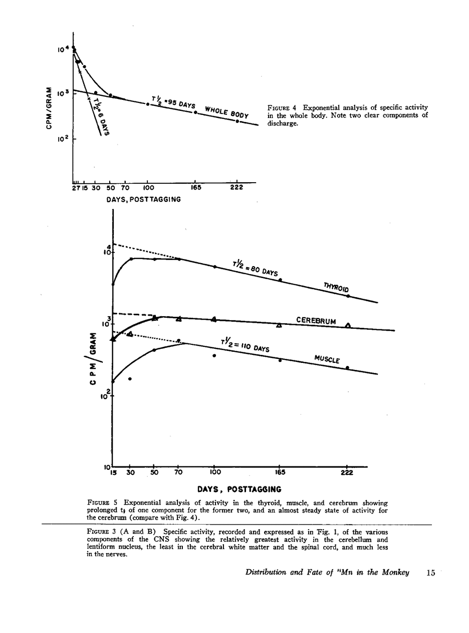 The fate and distribution of isotopic manganese administered as a single carrier-free dose of 200 μCi of maleate-54Mn to 12 rhesus monkeys was studied at different time periods from the 6th hr to the 278th day. Whole-body activity was measured, and all body organs and tissues and different parts of the central nervous system (CNS) were evaluated for specific activity, exponential analysis, and relative retention. Exponential analysis revealed a pattern of discharge with a fast and a slow component for the whole body and for many of the viscera. All parts of the CNS and, to a lesser degree, the thyroid and muscle showed an almost steady state of activity after the initial uptake. While the whole body and most organs and tissues appeared to discharge their radioactivity with the passage of time, first rapidly and then gradually, the CNS, endocrine glands, and muscle tissues showed persistent levels of specific activity. All components of the brain exhibited increasing relative retention, the lentiform nucleus and the cerebellum showing this more. It is suggested that the selective vulnerability of the brain in manganese miners might result from this inability on the part of the CNS to discharge the 54Mn with time. This investigation confirms and amplifies our earlier similar study on the rat.