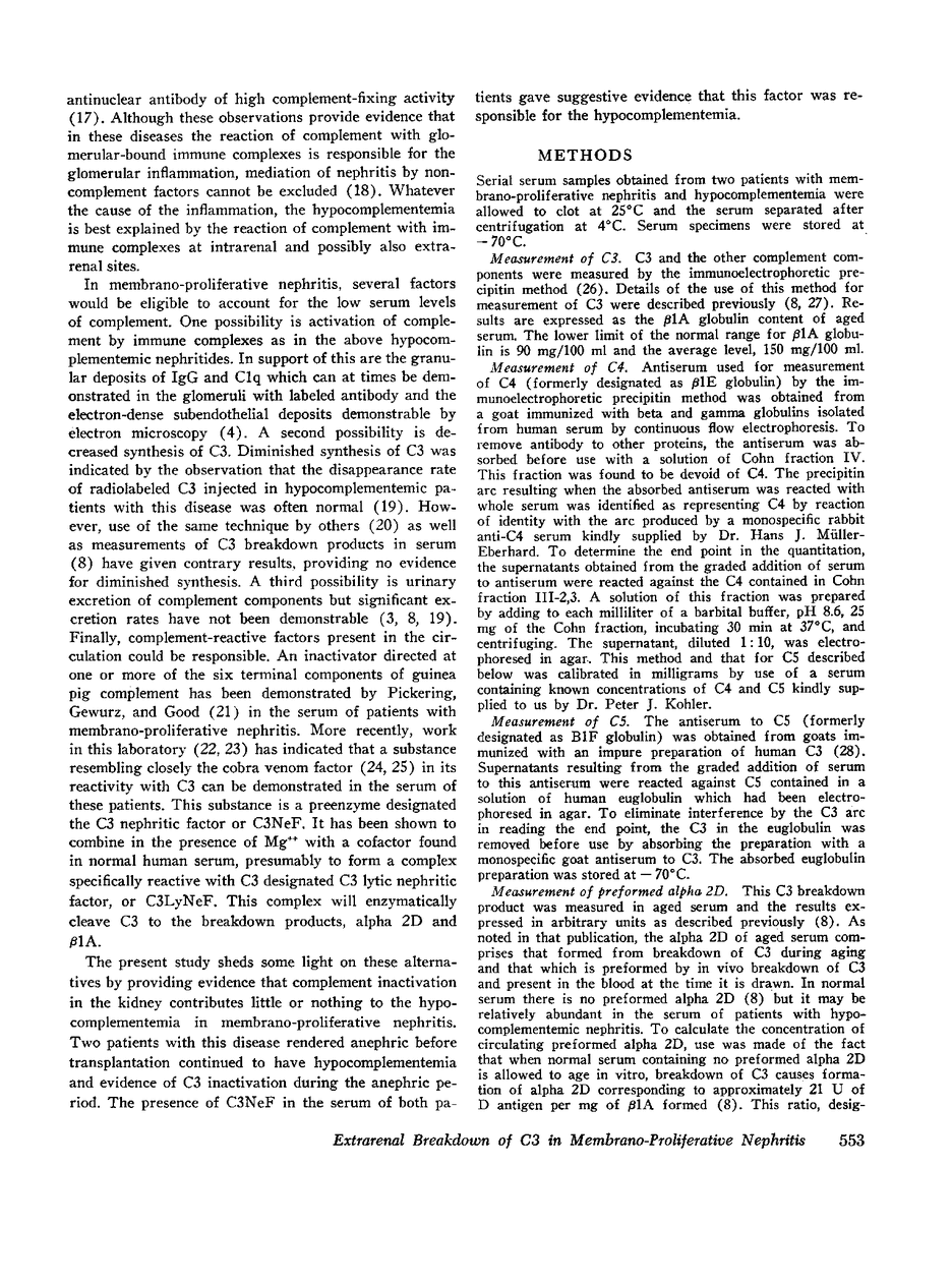 Serum levels of complement components and of C3 nephritic factor (C3NeF) were measured serially in two patients with membrano-proliferative glomerulonephritis who were subjected to bilateral nephrectomy and maintained by peritoneal dialysis for 2 wk before renal transplantation. In both patients, low levels of C3 and high levels of preformed alpha 2D, a C3 breakdown product, were present before nephrectomy and remained essentially unchanged during the anephric period. With transplantation, C3 levels rose towards normal and alpha 2D disappeared from the serum. The serum of both patients contained detectable amounts of C3NeF, a factor which has been shown to react with a cofactor found in normal serum to form an enzyme, designated C3 lytic nephritic factor (C3LyNeF), which will cleave C3 to form the breakdown products, β1A and alpha 2D. The level of C3NeF was high in one patient before nephrectomy, increased somewhat during the anephric period, and fell after transplantation. In the other patient, the C3NeF level was initially lower, remained relatively constant during the anephric period, and was not significantly affected by transplantation. In both patients, levels of C4 and C5 were either normal or elevated over the period of the study and bore no relationship to the C3 level. The following conclusions can be drawn from the data. The high levels of alpha 2D during the anephric period and the disappearance of this protein as C3 levels approach normal at the time of transplantation indicate that the low C3 levels were largely the result of C3 breakdown rather than diminished synthesis. The presence of C3NeF in detectable amounts in both patients suggest that C3LyNeF, formed by the reaction of C3NeF and cofactor, was responsible for the low C3 levels. Finally, the lack of effect of nephrectomy on C3, alpha 2D, and C3NeF levels indicate that the site of C3 breakdown was extrarenal and that C3NeF and cofactor are at least in large part of extrarenal origin.