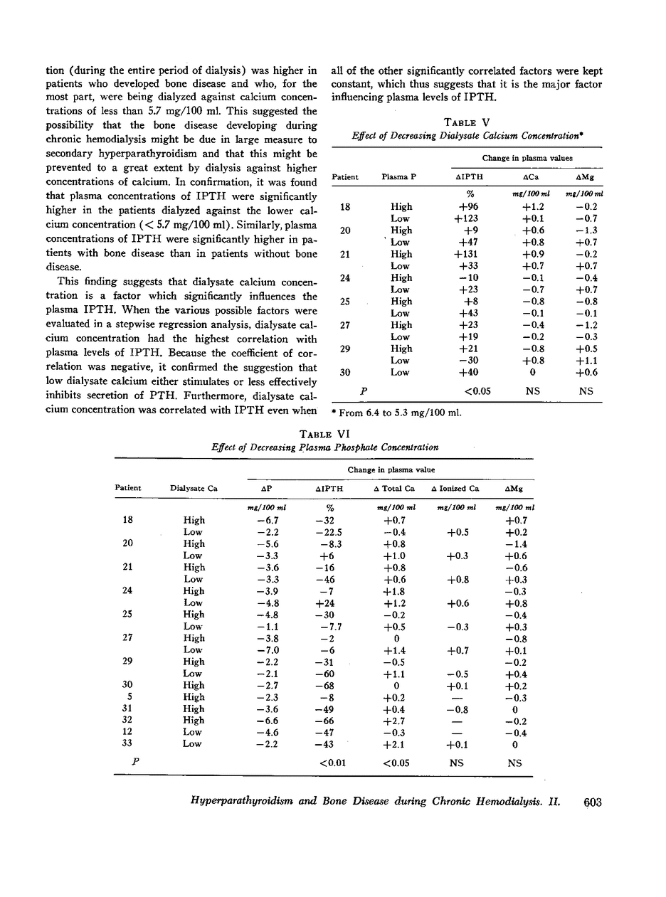 Plasma concentration of immunoreactive parathyroid hormone (IPTH) was measured in 18 patients who had been on a hemodialysis program for longer than 6 months. A negative correlation was found between the predialysis plasma concentration of IPTH and the mean concentration of calcium in the dialysate previously used: plasma concentrations of IPTH were higher in patients dialyzed against a calcium concentration between 4.9 and 5.6 mg/100 ml than in patients dialyzed against a calcium concentration of 6.0 mg/100 ml or more. Plasma concentrations of IPTH also were higher in patients with bone disease than in patients without bone disease. Furthermore, a positive correlation was found between predialysis plasma concentrations of IPTH and calcium, and between mean predialysis concentration of IPTH and phosphate. To obviate the possibility that individual differences in susceptibility could have accounted for the observed effects of plasma phosphate and of dialysate calcium, a 2 × 2 factorial study was conducted in seven of these patients to examine the independent effects of perturbation of each of these factors. It was observed that plasma concentration of IPTH was lowest with the combination of high dialysate calcium and low plasma phosphate, highest with the combination of low dialysate calcium and high plasma phosphate, and intermediate with the two other combinations. It is concluded that both dialysate calcium and plasma phosphate are important determinants of parathyroid function in these patients.