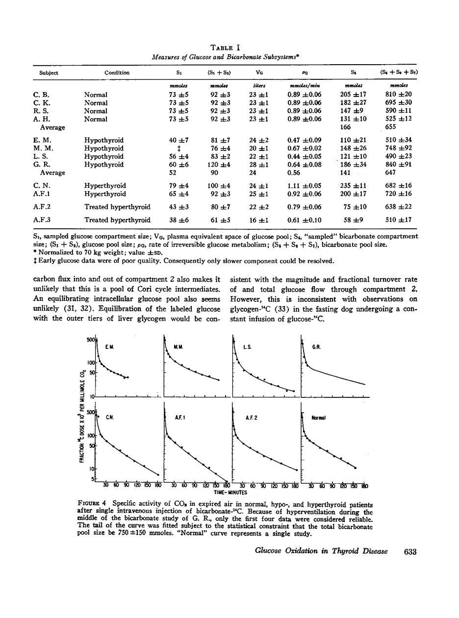 Glucose oxidation to CO2 in man at the fasted, steady state has been investigated in normal, hypothyroid, patients by monitoring the specific activity of plasma glucose and expired CO2 after intravenous injection of glucose-1-14C, glucose-6-14C, and sodium bicarbonate-24C in tracer amounts. Making certain stoichiometric assumptions about the oxidation of the C-1 and C-6 carbons of glucose to CO2, the data are incorporated into a multicompartmental model describing the kinetics of plasma glucose, plasma bicarbonate, and the conversion of glucose to CO2 by the hexose monophosphate pathway and all other series and parallel pathways which oxidize glucose carbon to CO2 (EMP-TCA). This formulation separates the distribution kinetics of glucose and bicarbonate from the kinetics of glucose oxidation to CO2. It allows the calculation of a minimal fraction (ϕt) of glucose irreversibly oxidized to CO2 which is based entirely on the duration of the experimental data. This calculation is independent of the extrapolative implications of the model beyond the experimental interval and of the particular model chosen to fit the data. All modeling and data fitting were performed on a digital computer with the SAAM program.
