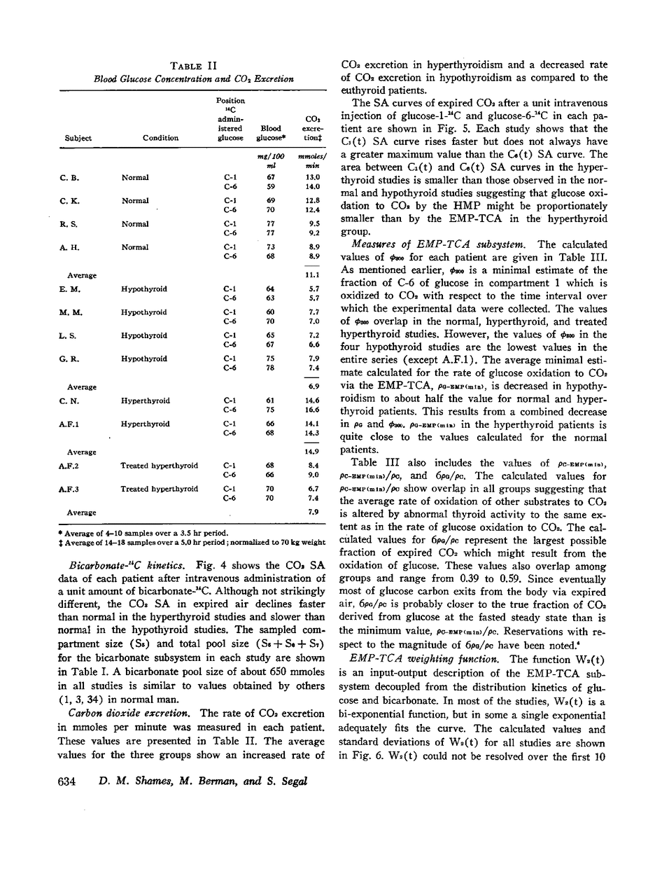Glucose oxidation to CO2 in man at the fasted, steady state has been investigated in normal, hypothyroid, patients by monitoring the specific activity of plasma glucose and expired CO2 after intravenous injection of glucose-1-14C, glucose-6-14C, and sodium bicarbonate-24C in tracer amounts. Making certain stoichiometric assumptions about the oxidation of the C-1 and C-6 carbons of glucose to CO2, the data are incorporated into a multicompartmental model describing the kinetics of plasma glucose, plasma bicarbonate, and the conversion of glucose to CO2 by the hexose monophosphate pathway and all other series and parallel pathways which oxidize glucose carbon to CO2 (EMP-TCA). This formulation separates the distribution kinetics of glucose and bicarbonate from the kinetics of glucose oxidation to CO2. It allows the calculation of a minimal fraction (ϕt) of glucose irreversibly oxidized to CO2 which is based entirely on the duration of the experimental data. This calculation is independent of the extrapolative implications of the model beyond the experimental interval and of the particular model chosen to fit the data. All modeling and data fitting were performed on a digital computer with the SAAM program.