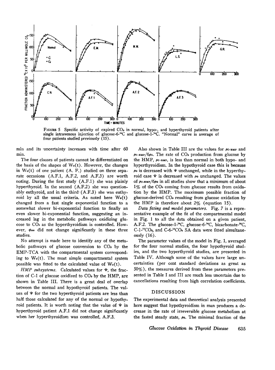 Glucose oxidation to CO2 in man at the fasted, steady state has been investigated in normal, hypothyroid, patients by monitoring the specific activity of plasma glucose and expired CO2 after intravenous injection of glucose-1-14C, glucose-6-14C, and sodium bicarbonate-24C in tracer amounts. Making certain stoichiometric assumptions about the oxidation of the C-1 and C-6 carbons of glucose to CO2, the data are incorporated into a multicompartmental model describing the kinetics of plasma glucose, plasma bicarbonate, and the conversion of glucose to CO2 by the hexose monophosphate pathway and all other series and parallel pathways which oxidize glucose carbon to CO2 (EMP-TCA). This formulation separates the distribution kinetics of glucose and bicarbonate from the kinetics of glucose oxidation to CO2. It allows the calculation of a minimal fraction (ϕt) of glucose irreversibly oxidized to CO2 which is based entirely on the duration of the experimental data. This calculation is independent of the extrapolative implications of the model beyond the experimental interval and of the particular model chosen to fit the data. All modeling and data fitting were performed on a digital computer with the SAAM program.