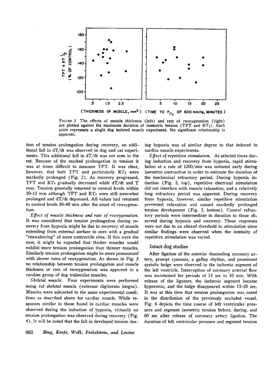 The mechanical behavior of isolated cat, rat, and dog ventricular muscle was examined during hypoxia and after reoxygenation. During hypoxia, an early abbreviation of tension duration was followed by a decline in the rate of tension development. After reoxygenation, a marked, early prolongation of tension development and relaxation time was invariably observed with little, if any, increase in peak tension. As recovery progressed, the duration of contraction gradually shortened as tension returned to control levels. This phenomenon was also observed in the intact dog heart after release of a coronary artery ligature. Isometric tension gauges sewn to ischemic portions of the left ventricle demonstrated that after reinstitution of coronary flow, segment tension duration “outlasts” the duration of left ventricular pressure development and is associated with ventricular irritability. Epicardial electrograms showed shortening of the QT interval within the ischemic segment with prolongation of the QT interval after release of the coronary ligature. Prolongation of tension development during recovery from hypoxia was not observed in experiments with rat skeletal muscle. These observations identify localized mechanical abnormalities during recovery from myocardial ischemia which may be important in the syndrome of acute coronary heart disease.