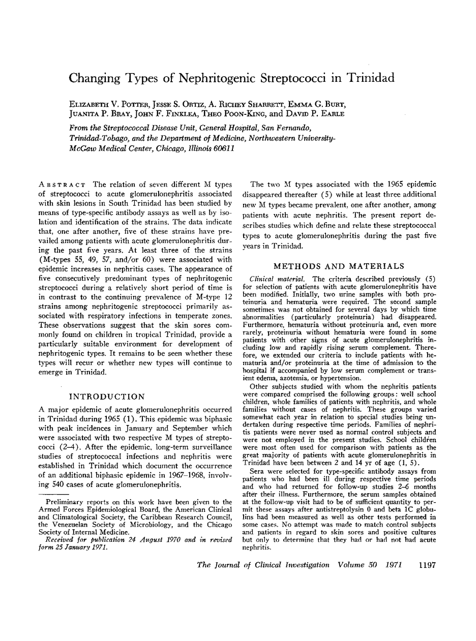 The relation of seven different M types of streptococci to acute glomerulonephritis associated with skin lesions in South Trinidad has been studied by means of type-specific antibody assays as well as by isolation and identification of the strains. The data indicate that, one after another, five of these strains have prevailed among patients with acute glomerulonephritis during the past five years. At least three of the strains (M-types 55, 49, 57, and/or 60) were associated with epidemic increases in nephritis cases. The appearance of five consecutively predominant types of nephritogenic streptococci during a relatively short period of time is in contrast to the continuing prevalence of M-type 12 strains among nephritogenic streptococci primarily associated with respiratory infections in temperate zones. These observations suggest that the skin sores commonly found on children in tropical Trinidad, provide a particularly suitable environment for development of nephritogenic types. It remains to be seen whether these types will recur or whether new types will continue to emerge in Trinidad.