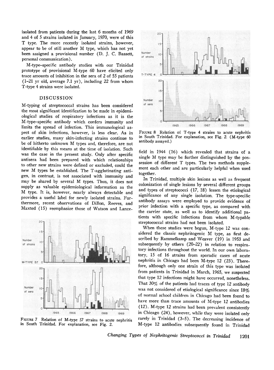 The relation of seven different M types of streptococci to acute glomerulonephritis associated with skin lesions in South Trinidad has been studied by means of type-specific antibody assays as well as by isolation and identification of the strains. The data indicate that, one after another, five of these strains have prevailed among patients with acute glomerulonephritis during the past five years. At least three of the strains (M-types 55, 49, 57, and/or 60) were associated with epidemic increases in nephritis cases. The appearance of five consecutively predominant types of nephritogenic streptococci during a relatively short period of time is in contrast to the continuing prevalence of M-type 12 strains among nephritogenic streptococci primarily associated with respiratory infections in temperate zones. These observations suggest that the skin sores commonly found on children in tropical Trinidad, provide a particularly suitable environment for development of nephritogenic types. It remains to be seen whether these types will recur or whether new types will continue to emerge in Trinidad.