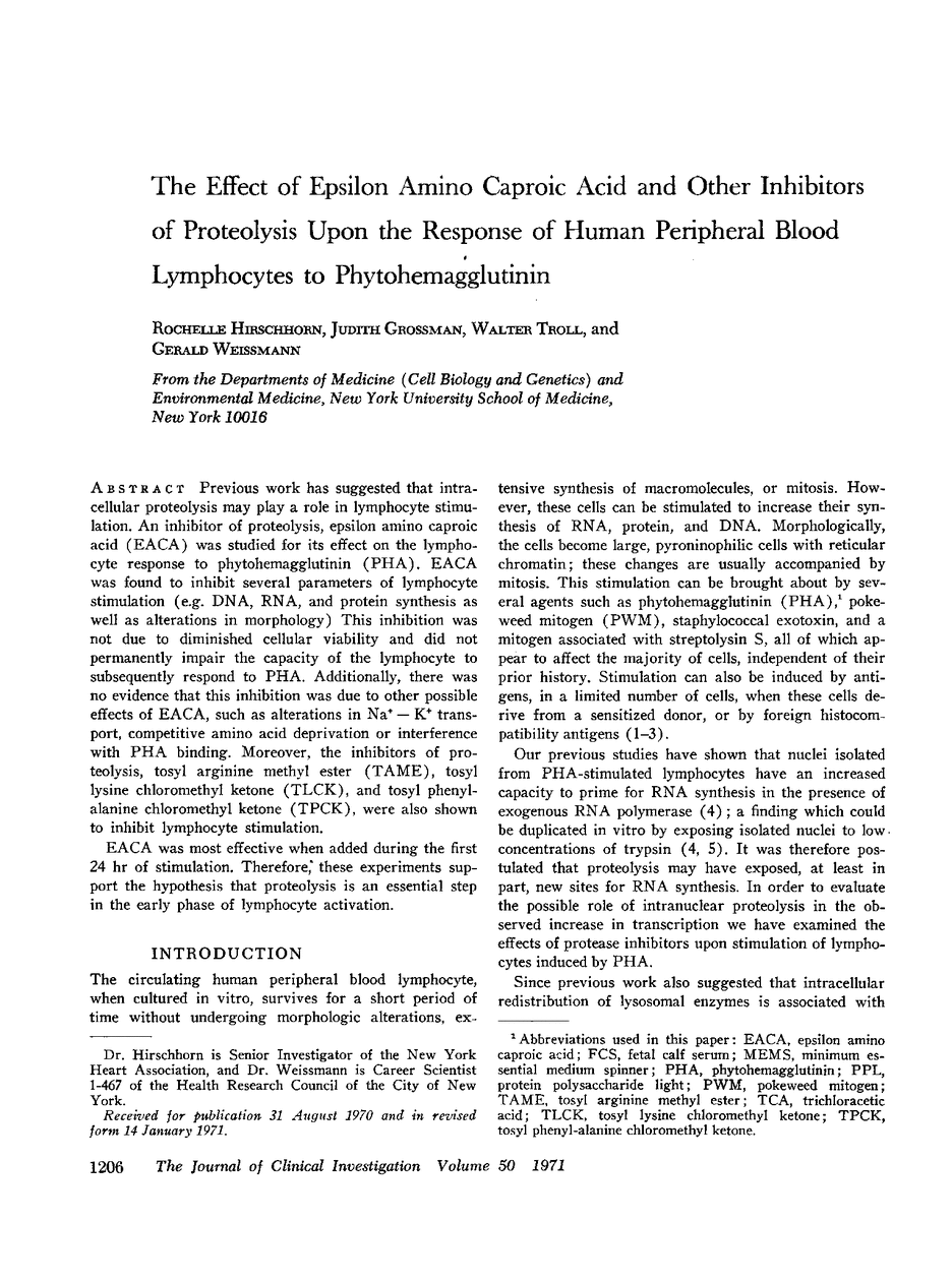 Previous work has suggested that intracellular proteolysis may play a role in lymphocyte stimulation. An inhibitor of proteolysis, epsilon amino caproic acid (EACA) was studied for its effect on the lymphocyte response to phytohemagglutinin (PHA). EACA was found to inhibit several parameters of lymphocyte stimulation (e.g. DNA, RNA, and protein synthesis as well as alterations in morphology) This inhibition was not due to diminished cellular viability and did not permanently impair the capacity of the lymphocyte to subsequently respond to PHA. Additionally, there was no evidence that this inhibition was due to other possible effects of EACA, such as alterations in Na+ — K+ transport, competitive amino acid deprivation or interference with PHA binding. Moreover, the inhibitors of proteolysis, tosyl arginine methyl ester (TAME), tosyl lysine chloromethyl ketone (TLCK), and tosyl phenyl-alanine chloromethyl ketone (TPCK), were also shown to inhibit lymphocyte stimulation.