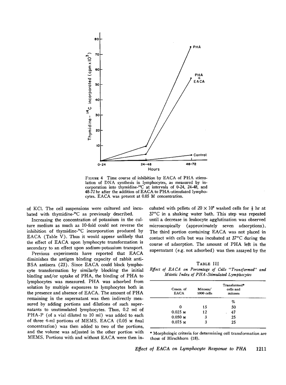 Previous work has suggested that intracellular proteolysis may play a role in lymphocyte stimulation. An inhibitor of proteolysis, epsilon amino caproic acid (EACA) was studied for its effect on the lymphocyte response to phytohemagglutinin (PHA). EACA was found to inhibit several parameters of lymphocyte stimulation (e.g. DNA, RNA, and protein synthesis as well as alterations in morphology) This inhibition was not due to diminished cellular viability and did not permanently impair the capacity of the lymphocyte to subsequently respond to PHA. Additionally, there was no evidence that this inhibition was due to other possible effects of EACA, such as alterations in Na+ — K+ transport, competitive amino acid deprivation or interference with PHA binding. Moreover, the inhibitors of proteolysis, tosyl arginine methyl ester (TAME), tosyl lysine chloromethyl ketone (TLCK), and tosyl phenyl-alanine chloromethyl ketone (TPCK), were also shown to inhibit lymphocyte stimulation.