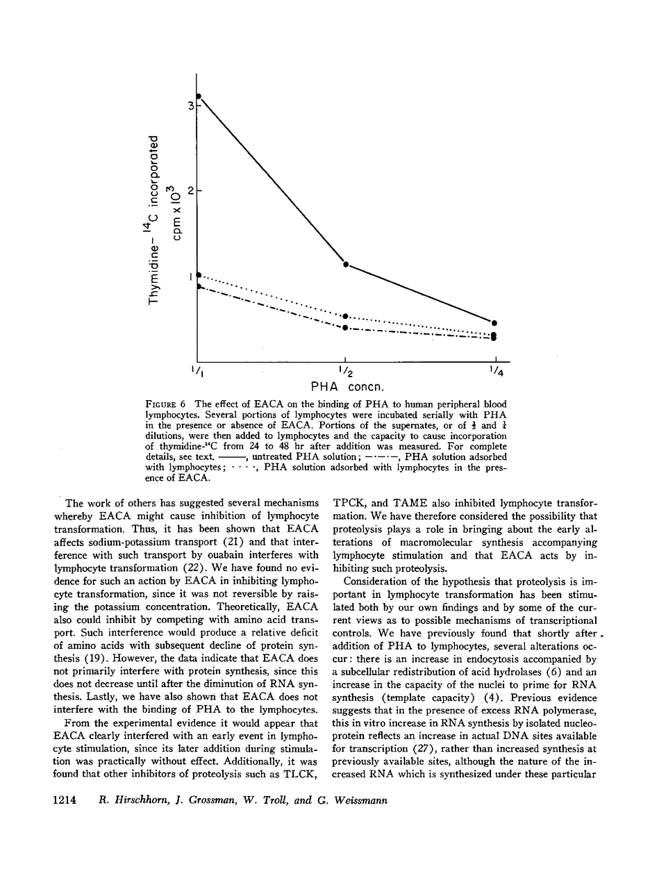 Previous work has suggested that intracellular proteolysis may play a role in lymphocyte stimulation. An inhibitor of proteolysis, epsilon amino caproic acid (EACA) was studied for its effect on the lymphocyte response to phytohemagglutinin (PHA). EACA was found to inhibit several parameters of lymphocyte stimulation (e.g. DNA, RNA, and protein synthesis as well as alterations in morphology) This inhibition was not due to diminished cellular viability and did not permanently impair the capacity of the lymphocyte to subsequently respond to PHA. Additionally, there was no evidence that this inhibition was due to other possible effects of EACA, such as alterations in Na+ — K+ transport, competitive amino acid deprivation or interference with PHA binding. Moreover, the inhibitors of proteolysis, tosyl arginine methyl ester (TAME), tosyl lysine chloromethyl ketone (TLCK), and tosyl phenyl-alanine chloromethyl ketone (TPCK), were also shown to inhibit lymphocyte stimulation.