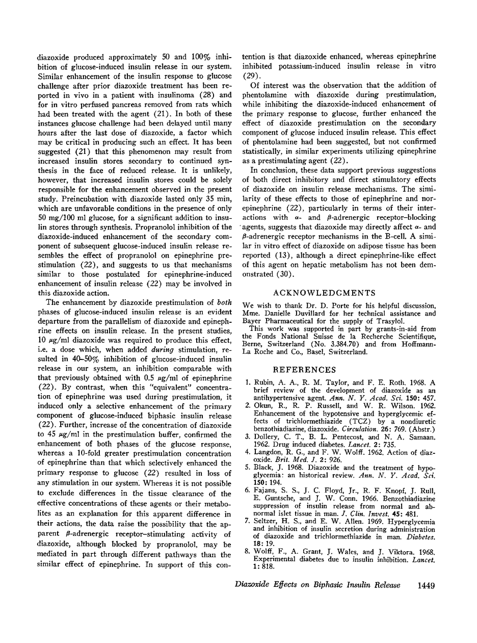 An in vitro system for perifusion of rat pancreas has been used to investigate the effects of diazoxide on glucose-induced insulin release. Administration of diazoxide with a stimulating concentration of glucose produced a dose-dependent suppression of insulin release. This effect was partly reversed by phentolamine. In the presence of nonstimulatory concentrations of glucose, diazoxide plus phentolamine, but neither alone, stimulated a biphasic release of insulin similar to that observed with 1-isopropyl norepinephrine. A prior period of perifusion with a low concentration of diazoxide enhanced the primary component of subsequent glucose-stimulated insulin release, an effect inhibited by addition of either phentolamine or propranolol to the diazoxide during this “prestimulation” period. These effects are similar to those observed with epinephrine. By contrast with epinephrine however, increasing the concentration of diazoxide during the period before glucose stimulation enhanced both the primary and secondary components of subsequent glucose-induced insulin release. These data suggest that at least some of the direct effects of diazoxide on the pancreas are mediated through α- and β-adrenergic receptor mechanisms.