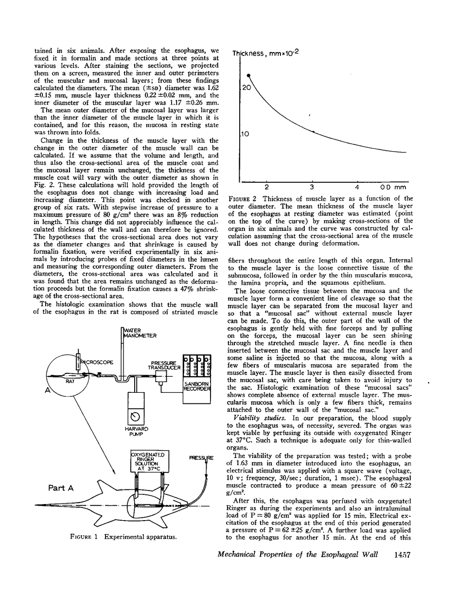 Pressure-diameter curves of the esophagus were obtained to define its mechanical properties. The mucosal contribution to the strength of the esophagus was negligible until the outer diameter almost doubled, suggesting that small intraluminal pressures are held by the muscle layer alone. For larger deformations mucosal contribution increased and at failure the mucosa held over one-half of the failure pressure of the esophagus.