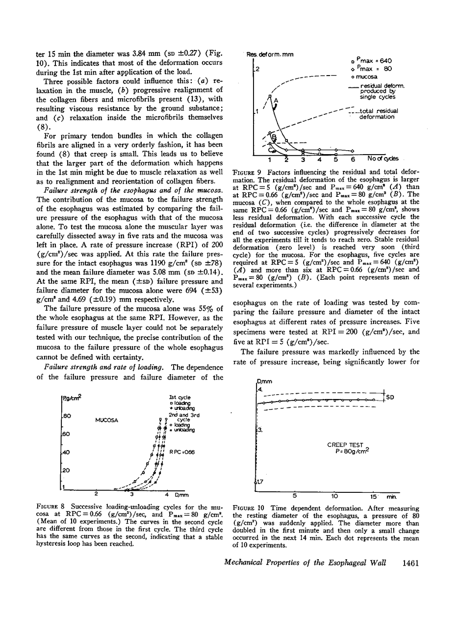 Pressure-diameter curves of the esophagus were obtained to define its mechanical properties. The mucosal contribution to the strength of the esophagus was negligible until the outer diameter almost doubled, suggesting that small intraluminal pressures are held by the muscle layer alone. For larger deformations mucosal contribution increased and at failure the mucosa held over one-half of the failure pressure of the esophagus.