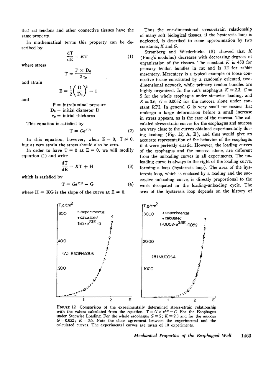 Pressure-diameter curves of the esophagus were obtained to define its mechanical properties. The mucosal contribution to the strength of the esophagus was negligible until the outer diameter almost doubled, suggesting that small intraluminal pressures are held by the muscle layer alone. For larger deformations mucosal contribution increased and at failure the mucosa held over one-half of the failure pressure of the esophagus.