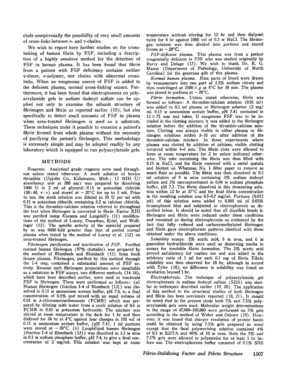 The formation of human fibrin from fibrinogen has been examined by polyacrylamide gel electrophoresis in sodium dodecyl sulfate, a method which separates a mixture of proteins on the basis of differences in molecular weight. It has been found that the plasma from a patient with a congenital deficiency of fibrin-stabilizing factor forms clots lacking the cross links among the α- and γchains found in normal, cross-linked human fibrin. The addition of purified fibrin-stabilizing factor or normal plasma to the deficient plasma results in extensive cross-linking of the chains. Thus, the fibrinogen in the fibrin-stabilizing factor deficient plasma appears to be normal and forms fibrin which contains dimeric, cross-linked γ-chains and polymeric, high molecular weight forms of α-chains. By the use of these electrophoretic methods, it has also been possible to develop a highly sensitive method for measuring the content of fibrin-stabilizing factor in plasma. This method depends upon the use of urea-treated fibrinogen, which is completely devoid of fibrin-stabilizing factor, but which forms the usual cross-linked subunits after conversion to fibrin by thrombin in the presence of fibrin-stabilizing factor.