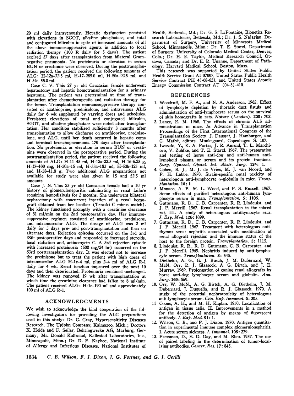 Equine immunoglobulin was detected along the glomerular basement membrane of three human homograft recipients who had been treated with equine anti-lymphocyte globulin. Anti-lymphocyte globulins, given these patients, were obtained by immunization of horses with lymphocytes from human spleens and/or lymph nodes and contained glomerular basement membrane-reactive antibodies. Quantitative paired-label isotope experiments (in rats) demonstrated that 30-170 μg/ml of kidney-fixing antibodies were present in these preparations. The anti-lymphocyte globulins formed a line of identity with a sheep anti-human glomerular basement serum when reacted against collagenase-solubilized human glomerular basement membrane in double diffusion in agar. The renal fixation of these antibodies was blocked by absorption with human glomerular basement membrane, but not by buffy-coat leukocytes, indicating that they were directed specifically toward antigens in the basement membrane and were not cross-reacting anti-lymphocyte antibodies.