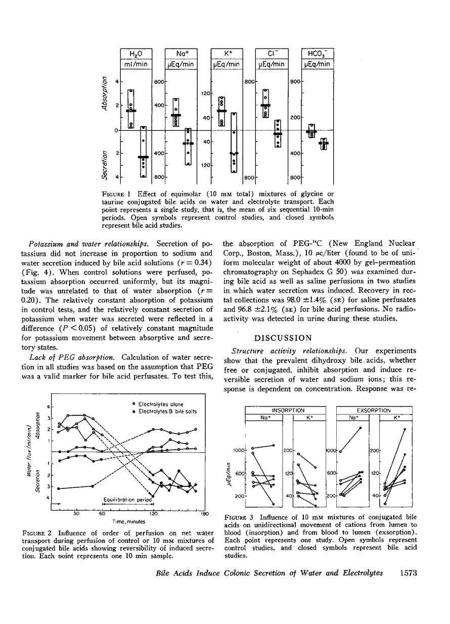 Each of the three major bile acids of man was tested for its influence on electrolyte and water absorption in the human colon. Transport from isotonic solutions, with or without added bile acids, was compared in 35 studies on 20 healthy volunteers by colonic perfusions under steady-state conditions. Electrolytes and water were always absorbed from control solutions, but dihydroxy bile acid solutions induced continuous secretion or inhibition of sodium, potassium, and water absorption, which was reversible. Deoxycholic acid caused consistent secretion at 3 mm concentrations, whereas chenodeoxycholic acid did not induce secretion until the concentration was 5 mm. The trihydroxy bile acid (cholic acid) produced no significant change in absorption at 10 mm. Inhibition of absorption was also induced by mixtures of the glycine or taurine conjugated bile acids. Secretion of sodium and chloride, induced by bile acid perfusion, was linearly correlated with secretion of water; potassium secretion was relatively constant regardless of the volume of secretion. These results establish a striking influence of bile acids on colonic absorptive activity, provide an explanation in part for the diarrhea that frequently accompanies ileal disease or resection, and imply that diarrhea should occur in other disease states that produce elevated concentrations of dihydroxy bile acids in the colonic lumen.