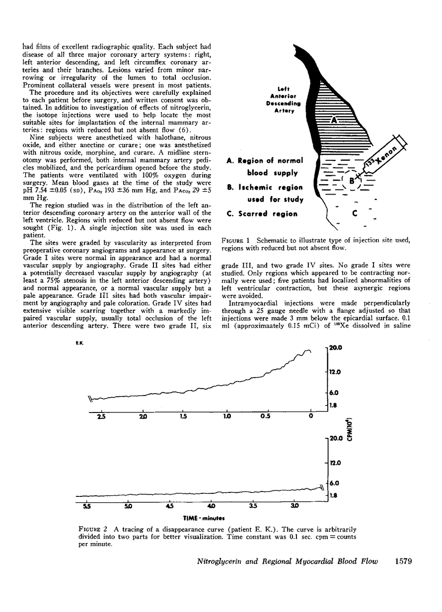 Regional myocardial blood flow before and after sublingual nitroglycerin was measured in 10 patients with coronary artery disease. During thoracotomy, 133Xe was injected directly into the subepicardium in diseased regions of the anterior left ventricular wall, and washout rates were recorded with a scintillation counter. All disappearance curves were closely approximated by two exponential decays analyzed as two parallel flow systems by the compartmental method. The appearance of a double exponential decay pattern in diseased regions suggests that the slow phase was associated with collateral blood flow, although nonhomogeneous myocardium-to-blood partition coefficients for xenon cannot be excluded. Nitroglycerin increased the rapid phase flow in 9 of 10 patients and the slow flow in 7 of 10 patients. Average flow increased in 9 of the 10 patients (P < 0.01). Mean rapid phase flow in the control state was 110 ml/100 g per min and after nitroglycerin increased to 132 ml/100 g per min (P < 0.01); slow phase flow increased from 12 ml/100 g per min to 15 ml/100 g per min (P < 0.05). It is concluded that, under these conditions, nitroglycerin improves perfusion in regions of diseased myocardium in patients with coronary artery disease.