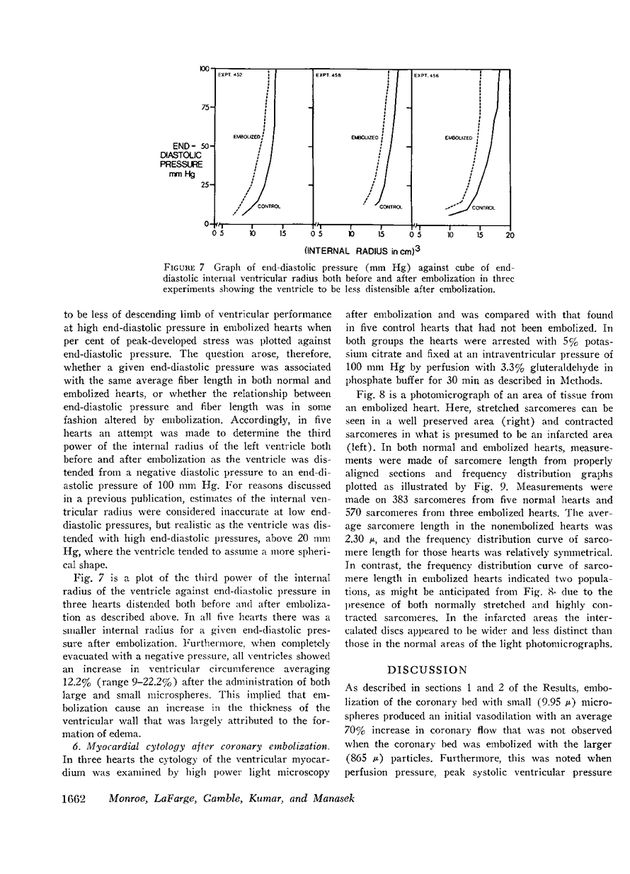 Coronary flow, left ventricular circumference, and left ventricular pressure were observed in the isovolumically contracting, isolated canine heart supported with arterial blood from a donor. Systolic pressure, heart rate, and coronary perfusion pressure were held constant while the coronary bed was progressively embolized with either large (average 865 μ) or small (average 10 μ) polystyrene microspheres. During embolization with large microspheres, coronary flow diminished progressively. After sufficient embolization, decreased ventricular performance was indicated by a rise in end-diastolic pressure. During embolization with small microspheres, coronary flow initially increased, which suggests the effective release of a vasodilator substance. Return of coronary flow to control levels occurred only after the end-diastolic pressure rose, on the average, to above 30 mm Hg. After embolization with both sizes of microspheres, ventricular diastolic pressure-volume relationships showed decreased ventricular compliance. This was attributed, in part, to edema of the ventricular wall and, in part, to focal shortening of the sarcomeres where the circulation was compromised. Embolization with both sizes of microspheres ultimately caused a decrease in ventricular performance, although when the systolic pressure was increased the usual relationship between peak developed wall stress, and end-diastolic pressure showed less of a descending limb than that found in the nonembolized, isolated heart.