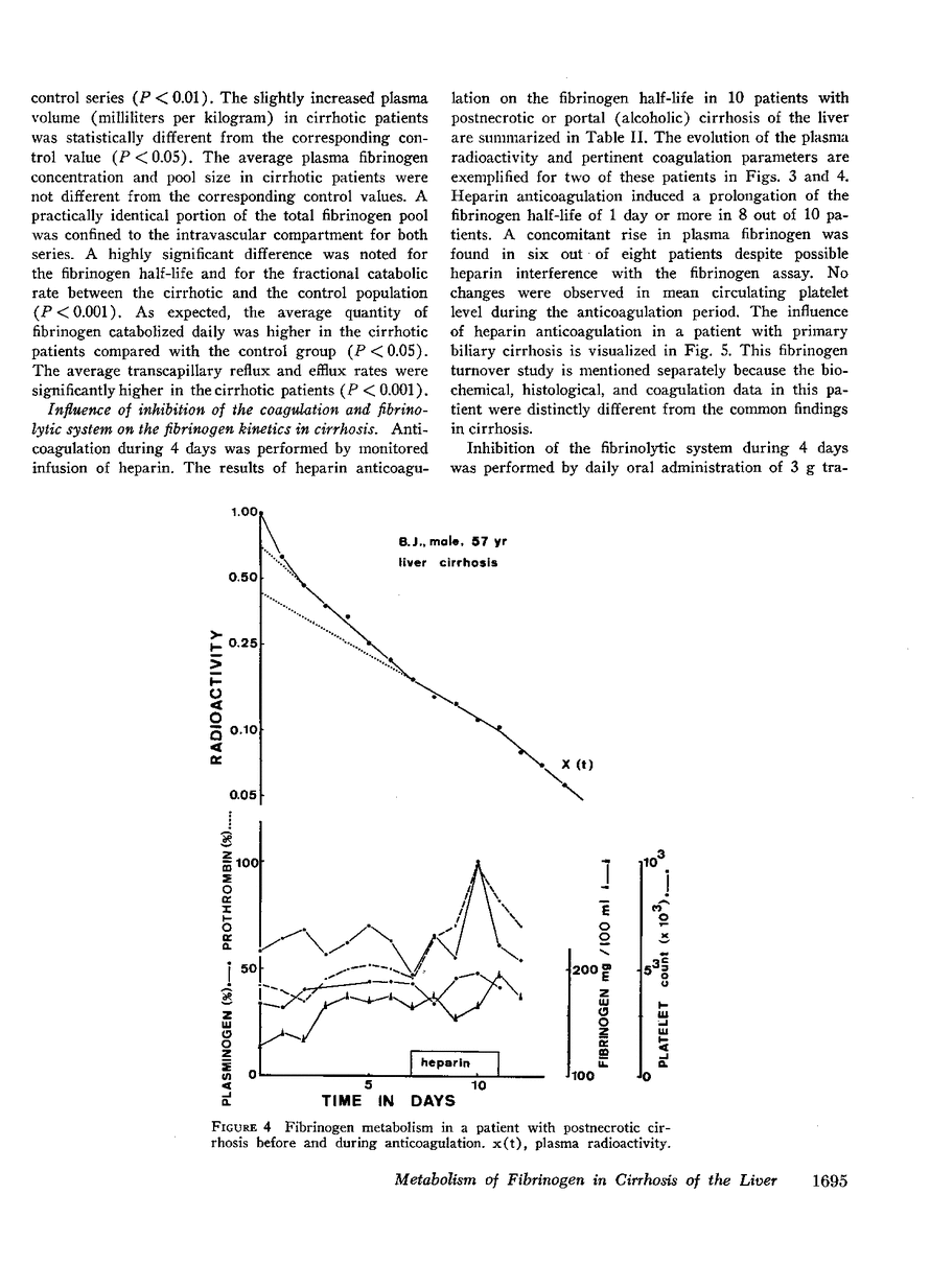 The metabolism of human fibrinogen labeled with radioactive iodine was studied in 50 patients with documented cirrhosis of the liver and in 35 healthy control subjects. Results in cirrhotic subjects were the following: plasma volume 47 ± 10 ml/kg; plasma fibrinogen concentration 250 ± 102 mg/100 ml; total plasma fibrinogen pool 118 ± 59 mg/kg, representing 0.73 ± 0.10 of the total body pool; fibrinogen half-life 2.99 ± 0.59 days; fractional catabolic rate 0.34 ± 0.09 of the plasma pool per day; absolute catabolic rate 39 ± 20 mg/kg per day; fractional transcapillary efflux rate 0.82 ± 0.30 of the plasma pool per day. Results in the control subjects were the following: plasma volume 42 ± 7 ml/kg; plasma fibrinogen concentration 284 ± 71 mg/100 ml; total plasma fibrinogen pool 119 ± 40 mg/kg, representing 0.72 ± 0.07 of the total body pool; fibrinogen half-life 4.14 ± 0.56 days; fractional catabolic rate 0.24 ± 0.04 of the plasma pool per day; absolute catabolic rate 28 ± 9 mg/kg per day; fractional transcapillary efflux rate 0.60 ± 0.26 of the plasma pool per day.