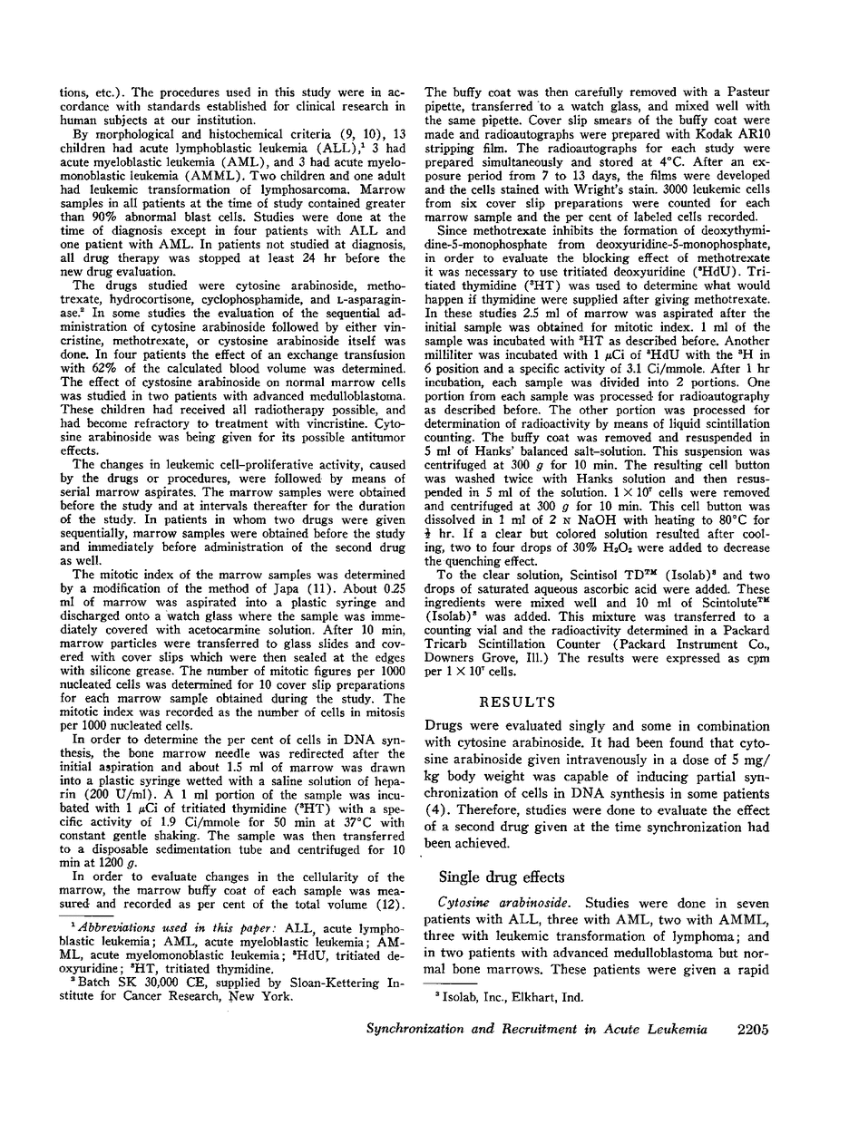 The in vivo effects of several chemotherapeutic agents on the mitotic cycle of leukemic blasts in the bone marrow were evaluated by serial measurements of cells in mitosis and in deoxyribonucleic acid (DNA) synthesis as indicated by ability to incorporate tritiated thymidine or tritiated deoxyuridine. 28 studies were done in 23 children and 1 adult. The changes in the marrow after a single injection of L-asparaginase, hydrocortisone, cyclophosphamide, cytosine arabinoside, methotrexate, and an exchange transfusion (62% of the total blood volume) were evaluated. L-asparaginase and hydrocortisone were found to arrest the entry of cells into the S period. Cyclophosphamide appeared to inhibit DNA synthesis, arrest cells in mitosis, and inhibit the entry of cells into the S period. Cytosine arabinoside, and methotrexate inhibited DNA synthesis. During the period of time the cells were inhibited in the S phase by these two drugs, cells continued to enter the S period. Thus partial synchronization was achieved after these two drugs. An exchange transfusion had no consistent effect on the mitotic cycle, but partial synchronization in the S period was seen in one patient.