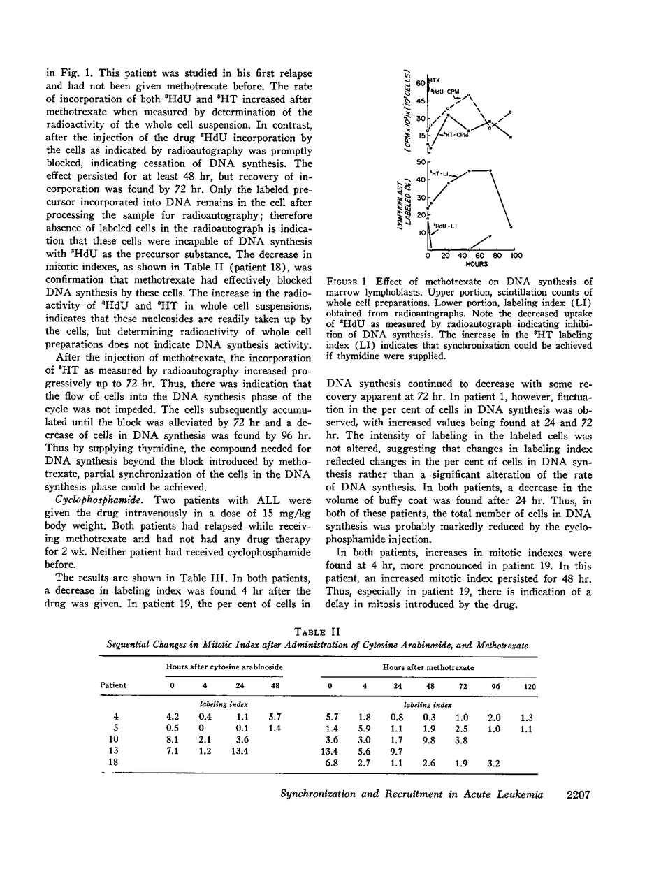 The in vivo effects of several chemotherapeutic agents on the mitotic cycle of leukemic blasts in the bone marrow were evaluated by serial measurements of cells in mitosis and in deoxyribonucleic acid (DNA) synthesis as indicated by ability to incorporate tritiated thymidine or tritiated deoxyuridine. 28 studies were done in 23 children and 1 adult. The changes in the marrow after a single injection of L-asparaginase, hydrocortisone, cyclophosphamide, cytosine arabinoside, methotrexate, and an exchange transfusion (62% of the total blood volume) were evaluated. L-asparaginase and hydrocortisone were found to arrest the entry of cells into the S period. Cyclophosphamide appeared to inhibit DNA synthesis, arrest cells in mitosis, and inhibit the entry of cells into the S period. Cytosine arabinoside, and methotrexate inhibited DNA synthesis. During the period of time the cells were inhibited in the S phase by these two drugs, cells continued to enter the S period. Thus partial synchronization was achieved after these two drugs. An exchange transfusion had no consistent effect on the mitotic cycle, but partial synchronization in the S period was seen in one patient.