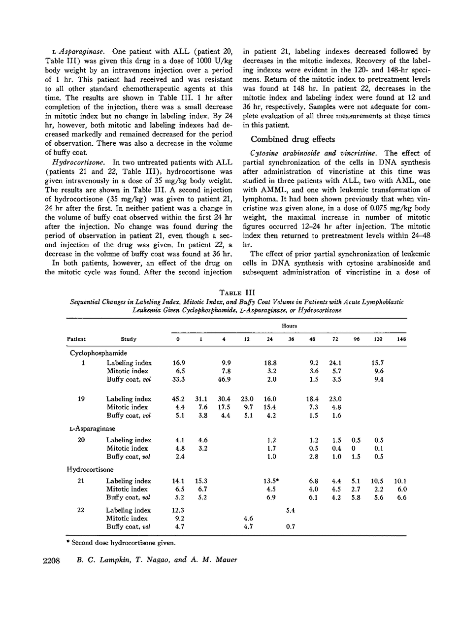The in vivo effects of several chemotherapeutic agents on the mitotic cycle of leukemic blasts in the bone marrow were evaluated by serial measurements of cells in mitosis and in deoxyribonucleic acid (DNA) synthesis as indicated by ability to incorporate tritiated thymidine or tritiated deoxyuridine. 28 studies were done in 23 children and 1 adult. The changes in the marrow after a single injection of L-asparaginase, hydrocortisone, cyclophosphamide, cytosine arabinoside, methotrexate, and an exchange transfusion (62% of the total blood volume) were evaluated. L-asparaginase and hydrocortisone were found to arrest the entry of cells into the S period. Cyclophosphamide appeared to inhibit DNA synthesis, arrest cells in mitosis, and inhibit the entry of cells into the S period. Cytosine arabinoside, and methotrexate inhibited DNA synthesis. During the period of time the cells were inhibited in the S phase by these two drugs, cells continued to enter the S period. Thus partial synchronization was achieved after these two drugs. An exchange transfusion had no consistent effect on the mitotic cycle, but partial synchronization in the S period was seen in one patient.