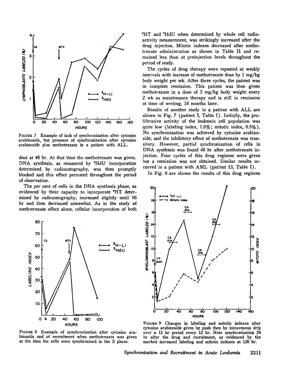 The in vivo effects of several chemotherapeutic agents on the mitotic cycle of leukemic blasts in the bone marrow were evaluated by serial measurements of cells in mitosis and in deoxyribonucleic acid (DNA) synthesis as indicated by ability to incorporate tritiated thymidine or tritiated deoxyuridine. 28 studies were done in 23 children and 1 adult. The changes in the marrow after a single injection of L-asparaginase, hydrocortisone, cyclophosphamide, cytosine arabinoside, methotrexate, and an exchange transfusion (62% of the total blood volume) were evaluated. L-asparaginase and hydrocortisone were found to arrest the entry of cells into the S period. Cyclophosphamide appeared to inhibit DNA synthesis, arrest cells in mitosis, and inhibit the entry of cells into the S period. Cytosine arabinoside, and methotrexate inhibited DNA synthesis. During the period of time the cells were inhibited in the S phase by these two drugs, cells continued to enter the S period. Thus partial synchronization was achieved after these two drugs. An exchange transfusion had no consistent effect on the mitotic cycle, but partial synchronization in the S period was seen in one patient.