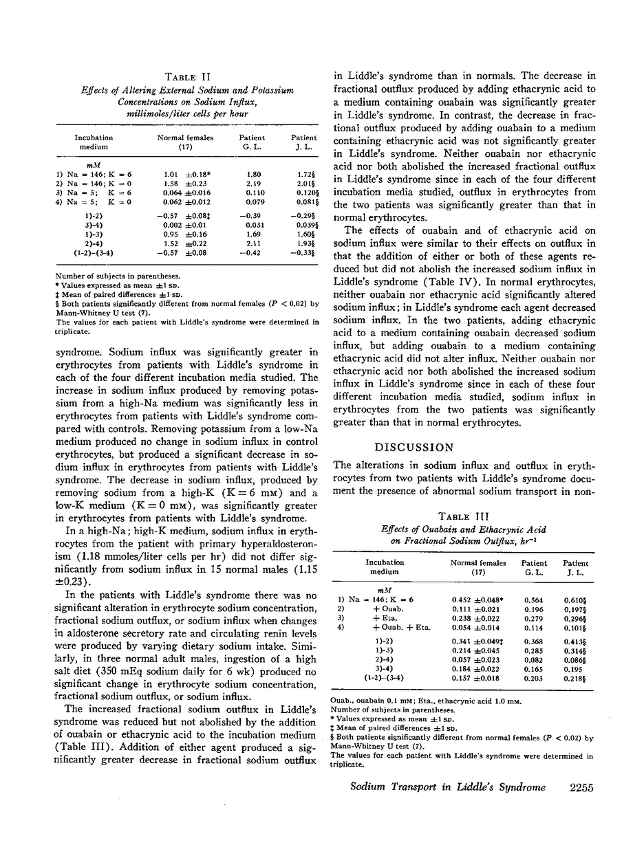 We have documented the presence of abnormal sodium transport in Liddle's syndrome by measuring sodium concentration, sodium influx, and fractional sodium outflux in vitro in erythrocytes from normal subjects, two patients with Liddle's syndrome, and one patient with primary hyperaldosteronism. Sodium influx and fractional sodium outflux, but not sodium concentration, were significantly increased in patients with Liddle's syndrome. Sodium outflux in a patient with primary hyperaldosteronism did not differ significantly from normal. These alterations of sodium transport in erythrocytes from patients with Liddle's syndrome were not attributable to circulating levels of aldosterone, renin, angiotensin, or serum potassium. Furthermore, changes in aldosterone secretory rate and levels of circulating renin produced by varying dietary sodium intake, did not alter sodium influx or fractional sodium outflux in either patients with Liddle's syndrome or normal subjects. The response of fractional sodium outflux and sodium influx to ouabain, ethacrynic acid, and to changes in the cation composition of the incubation medium suggests that the increased sodium fluxes in Liddle's syndrome do not result solely from a quantitative increase in those components of sodium transport which occur in normal human erythrocytes. Instead, at least a portion of the increased erythrocyte sodium transport in Liddle's syndrome represents a component of sodium transport which does not occur in normal human erythrocytes.