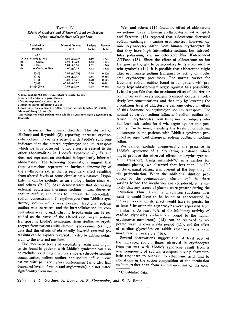 We have documented the presence of abnormal sodium transport in Liddle's syndrome by measuring sodium concentration, sodium influx, and fractional sodium outflux in vitro in erythrocytes from normal subjects, two patients with Liddle's syndrome, and one patient with primary hyperaldosteronism. Sodium influx and fractional sodium outflux, but not sodium concentration, were significantly increased in patients with Liddle's syndrome. Sodium outflux in a patient with primary hyperaldosteronism did not differ significantly from normal. These alterations of sodium transport in erythrocytes from patients with Liddle's syndrome were not attributable to circulating levels of aldosterone, renin, angiotensin, or serum potassium. Furthermore, changes in aldosterone secretory rate and levels of circulating renin produced by varying dietary sodium intake, did not alter sodium influx or fractional sodium outflux in either patients with Liddle's syndrome or normal subjects. The response of fractional sodium outflux and sodium influx to ouabain, ethacrynic acid, and to changes in the cation composition of the incubation medium suggests that the increased sodium fluxes in Liddle's syndrome do not result solely from a quantitative increase in those components of sodium transport which occur in normal human erythrocytes. Instead, at least a portion of the increased erythrocyte sodium transport in Liddle's syndrome represents a component of sodium transport which does not occur in normal human erythrocytes.
