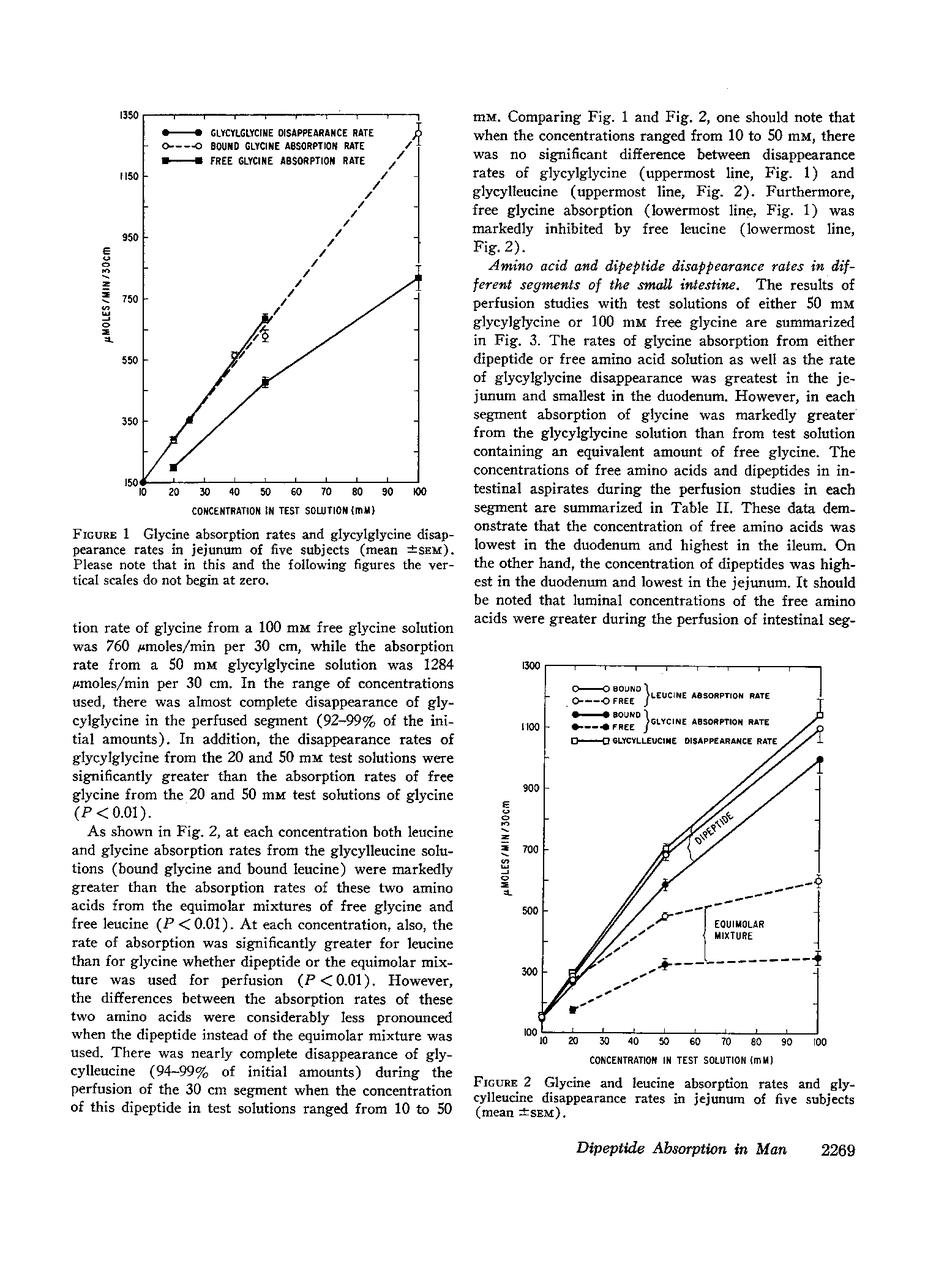 A 30 cm segment of the duodenum, jejunum, or ileum of normal human volunteers was perfused, on separate occasions, with test solutions containing either glycylglycine, free glycine, glycylleucine, or equimolar amounts of free glycine and free leucine. Luminal fluid contained no hydrolytic activity against glycylglycine and minimal activity against glycylleucine. In each intestinal segment, amino acid absorption rates were significantly greater from the test solutions containing the same amount of amino acids in dipeptide than in free form(as high as 185% increase). Perfusion of each intestinal segment with a test solution containing the equimolar mixture of free glycine and free leucine always resulted in a greater leucine than glycine absorption rate. This preferential absorption of leucine, however, was either diminished (jejunum) or almost abolished (duodenum and ileum) when the glycylleucine solution instead of the equimolar mixture was presented to the intestinal mucosa. Among the three segments, the duodenum exhibited the least potential for the disappearance of dipeptides. The jejunal and ileal dipeptide disappearance rates were either similar for glycylleucine (94% vs. 92%) or slightly different for glycylglycine (92% vs. 79%). Despite lack of a remarkable difference in the disappearance rates, absorption rates of constituent amino acids were markedly greater in the jejunum than in the ileum. This reduced amino acid absorption was brought about by a greater accumulation of free amino acids in the lumen of the ileal segment (3 to 10-fold difference). Inhibition of free glycine absorption by leucine during the perfusion of the intestine with a test solution containing glycylglycine and leucine did not result in any greater concentration of free glycine in the lumen than when the glycylglycine test solution did not contain free leucine. Similarly, inhibition of free glycine and free leucine absorption by isoleucine was not accompanied by any remarkable alteration of absorption rates of the constituent amino acids of glycylleucine. The results of these studies suggest that: (a) dipeptide disappearance in the gut lumen is principally accomplished by intact absorption and not by hydrolysis; (b) intracellular hydrolysis of dipeptides is markedly greater in the ileum than in the jejunum, while dipeptide absorption rates are either similar or only slightly different in these two segments; (c) there is no appreciable hydrolysis of glycylglycine by the membrane-bound enzymes and only a small fraction of glycylleucine is hydrolyzed by these enzymes.