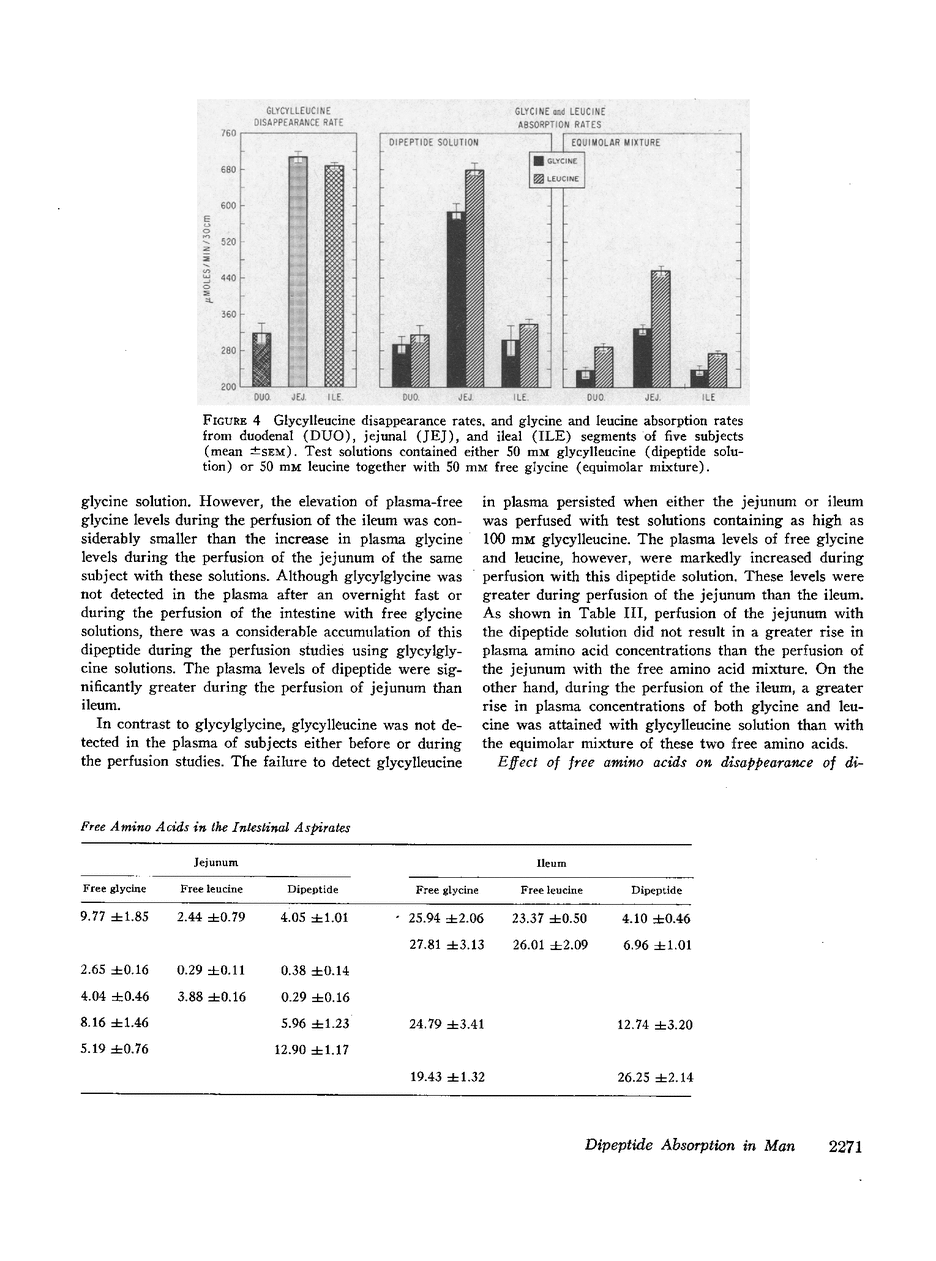 A 30 cm segment of the duodenum, jejunum, or ileum of normal human volunteers was perfused, on separate occasions, with test solutions containing either glycylglycine, free glycine, glycylleucine, or equimolar amounts of free glycine and free leucine. Luminal fluid contained no hydrolytic activity against glycylglycine and minimal activity against glycylleucine. In each intestinal segment, amino acid absorption rates were significantly greater from the test solutions containing the same amount of amino acids in dipeptide than in free form(as high as 185% increase). Perfusion of each intestinal segment with a test solution containing the equimolar mixture of free glycine and free leucine always resulted in a greater leucine than glycine absorption rate. This preferential absorption of leucine, however, was either diminished (jejunum) or almost abolished (duodenum and ileum) when the glycylleucine solution instead of the equimolar mixture was presented to the intestinal mucosa. Among the three segments, the duodenum exhibited the least potential for the disappearance of dipeptides. The jejunal and ileal dipeptide disappearance rates were either similar for glycylleucine (94% vs. 92%) or slightly different for glycylglycine (92% vs. 79%). Despite lack of a remarkable difference in the disappearance rates, absorption rates of constituent amino acids were markedly greater in the jejunum than in the ileum. This reduced amino acid absorption was brought about by a greater accumulation of free amino acids in the lumen of the ileal segment (3 to 10-fold difference). Inhibition of free glycine absorption by leucine during the perfusion of the intestine with a test solution containing glycylglycine and leucine did not result in any greater concentration of free glycine in the lumen than when the glycylglycine test solution did not contain free leucine. Similarly, inhibition of free glycine and free leucine absorption by isoleucine was not accompanied by any remarkable alteration of absorption rates of the constituent amino acids of glycylleucine. The results of these studies suggest that: (a) dipeptide disappearance in the gut lumen is principally accomplished by intact absorption and not by hydrolysis; (b) intracellular hydrolysis of dipeptides is markedly greater in the ileum than in the jejunum, while dipeptide absorption rates are either similar or only slightly different in these two segments; (c) there is no appreciable hydrolysis of glycylglycine by the membrane-bound enzymes and only a small fraction of glycylleucine is hydrolyzed by these enzymes.