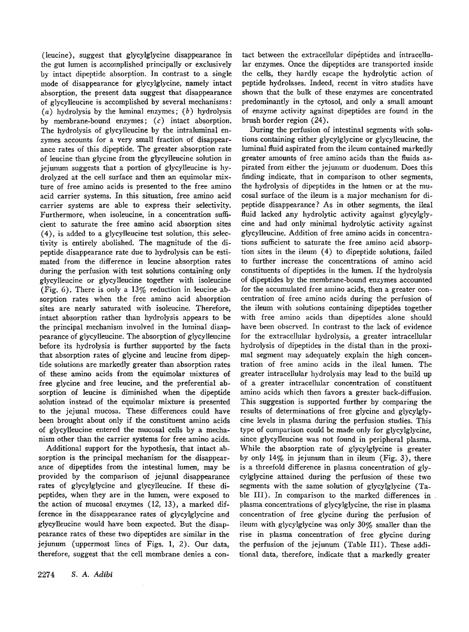 A 30 cm segment of the duodenum, jejunum, or ileum of normal human volunteers was perfused, on separate occasions, with test solutions containing either glycylglycine, free glycine, glycylleucine, or equimolar amounts of free glycine and free leucine. Luminal fluid contained no hydrolytic activity against glycylglycine and minimal activity against glycylleucine. In each intestinal segment, amino acid absorption rates were significantly greater from the test solutions containing the same amount of amino acids in dipeptide than in free form(as high as 185% increase). Perfusion of each intestinal segment with a test solution containing the equimolar mixture of free glycine and free leucine always resulted in a greater leucine than glycine absorption rate. This preferential absorption of leucine, however, was either diminished (jejunum) or almost abolished (duodenum and ileum) when the glycylleucine solution instead of the equimolar mixture was presented to the intestinal mucosa. Among the three segments, the duodenum exhibited the least potential for the disappearance of dipeptides. The jejunal and ileal dipeptide disappearance rates were either similar for glycylleucine (94% vs. 92%) or slightly different for glycylglycine (92% vs. 79%). Despite lack of a remarkable difference in the disappearance rates, absorption rates of constituent amino acids were markedly greater in the jejunum than in the ileum. This reduced amino acid absorption was brought about by a greater accumulation of free amino acids in the lumen of the ileal segment (3 to 10-fold difference). Inhibition of free glycine absorption by leucine during the perfusion of the intestine with a test solution containing glycylglycine and leucine did not result in any greater concentration of free glycine in the lumen than when the glycylglycine test solution did not contain free leucine. Similarly, inhibition of free glycine and free leucine absorption by isoleucine was not accompanied by any remarkable alteration of absorption rates of the constituent amino acids of glycylleucine. The results of these studies suggest that: (a) dipeptide disappearance in the gut lumen is principally accomplished by intact absorption and not by hydrolysis; (b) intracellular hydrolysis of dipeptides is markedly greater in the ileum than in the jejunum, while dipeptide absorption rates are either similar or only slightly different in these two segments; (c) there is no appreciable hydrolysis of glycylglycine by the membrane-bound enzymes and only a small fraction of glycylleucine is hydrolyzed by these enzymes.