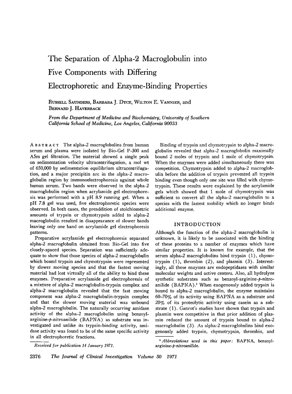 The alpha-2 macroglobulins from human serum and plasma were isolated by Bio-Gel P-300 and A5m gel filtration. The material showed a single peak on sedimentation velocity ultracentrifugation, a mol wt of 650,000 by sedimentation equilibrium ultracentrifugation, and a major precipitin arc in the alpha-2 macroglobulin region by immunoelectrophoresis against whole human serum. Two bands were observed in the alpha-2 macroglobulin region when acrylamide gel electrophoresis was performed with a pH 8.9 running gel. When a pH 7.8 gel was used, five electrophoretic species were observed. In both cases, the preaddition of stoichiometric amounts of trypsin or chymotrypsin added to alpha-2 macroglobulin resulted in disappearance of slower bands leaving only one band on acrylamide gel electrophoresis patterns.