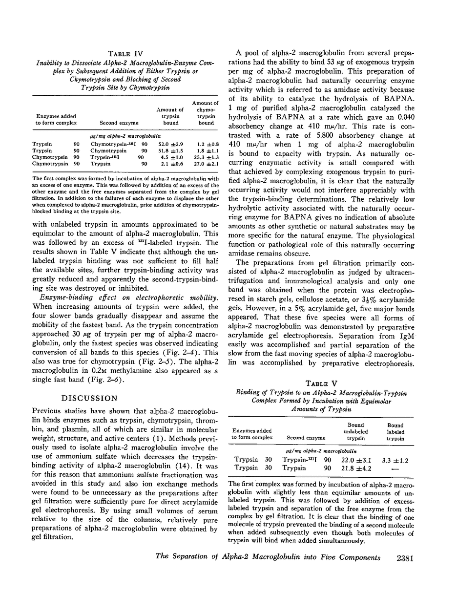 The alpha-2 macroglobulins from human serum and plasma were isolated by Bio-Gel P-300 and A5m gel filtration. The material showed a single peak on sedimentation velocity ultracentrifugation, a mol wt of 650,000 by sedimentation equilibrium ultracentrifugation, and a major precipitin arc in the alpha-2 macroglobulin region by immunoelectrophoresis against whole human serum. Two bands were observed in the alpha-2 macroglobulin region when acrylamide gel electrophoresis was performed with a pH 8.9 running gel. When a pH 7.8 gel was used, five electrophoretic species were observed. In both cases, the preaddition of stoichiometric amounts of trypsin or chymotrypsin added to alpha-2 macroglobulin resulted in disappearance of slower bands leaving only one band on acrylamide gel electrophoresis patterns.