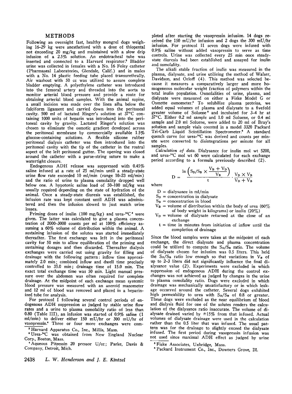 The present study was carried out to determine if antidiuretic hormone (ADH) altered the solute handling characteristics of the peritoneal membrane. Lightly anesthetized dogs primed with urea-14C (60 mol wt) and inulin (5200 mol wt) were volume expanded with hypotonic saline solution to suppress endogenous ADH as assessed by urine/plasma osmolality. With ADH suppressed, two to three control peritoneal dialysis exchanges were carried out. A constant infusion of ADH in a physiologic dose of 150 mU/hr in saline was begun and the urine/plasma osmolality followed until it was significantly greater than one. Two to three experimental dialysis exchanges were then carried out. Dialysance across the peritoneal membrane was calculated for inulin (DI) and urea (DU). In 16 such studies DU fell in all but three (the mean value for the fall was 2.8 ±2.6 ml/min; P < 0.001). DI varied randomly and showed no significant change. In all 16 studies DI/DU rose (DI/DU = 0.054 ± 0.054; P < 0.005). Seven dogs were studied with an identical protocol but saline was infused without ADH. DU and the dialysance ratio varied randomly. DU fell in one and did not change or rose in four and DI/DU rose in two and fell in three. The data are interpreted to show a fall in area but an increase in mean pore radius of the “peritoneal membrane” in response to physiologic amounts of intravenous ADH. The fall in area is consistent with a decreasing splanchnic blood flow.