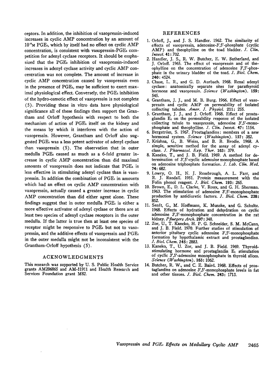 Vasopressin increased adenyl cyclase activity in homogenates of both inner and outer renal medulla of the rat. It also increased the concentration of cyclic 3′,5′-adenosine monophosphate (AMP) in slices of both inner and outer medulla but not in renal cortex. In the inner medulla, a concentration of prostaglandin E1 (PGE1), which was ineffective by itself significantly reduced the stimulation of adenyl cyclase activity and cyclic AMP concentration induced by vasopressin. These results are consistent with the hypothesis that PGE1 can compete with vasopressin for adenyl cyclase-binding sites. However, the findings in the outer medulla suggest the situation is more complex. Although 10-8 M PGE1 had no effect by itself and inhibited the vasopressin-induced elevation of cyclic AMP, larger amounts of PGE1 increased both adenyl cyclase activity and cyclic AMP levels. The maximum effect on the latter parameter was at least 6 times as great as that of maximum amounts of vasopressin.