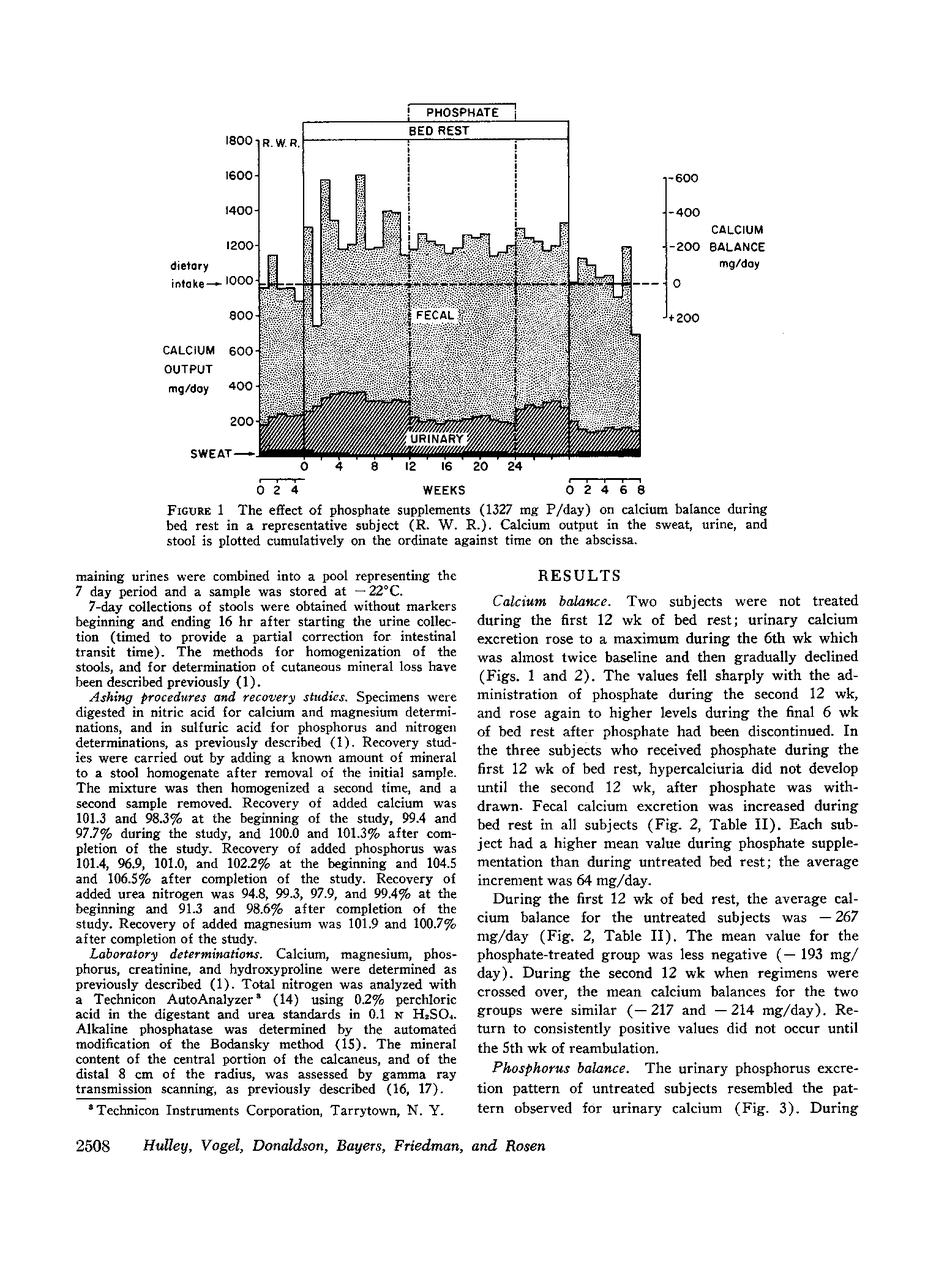 Five healthy young men were studied during 24-30 wk of continuous bed rest. During the first 12 wk of bed rest, untreated subjects increased calcium excretion in the urine by 109 mg/day and in the feces by 147 mg/day. The rate of total body calcium loss was 0.5-0.7% per month. Losses of central calcaneus mineral, assessed by gamma ray transmission scanning, occurred at a tenfold higher rate, whereas the mineral content of the radius did not change. Changes in phosphorus balance resembled the calcium pattern, and increased excretion of nitrogen and hydroxyproline also occurred during bed rest. Upon reambulation, the subjects' calcium balance became positive in 1 month and recovery of their calcaneus mineral was complete within 10-20 wk.