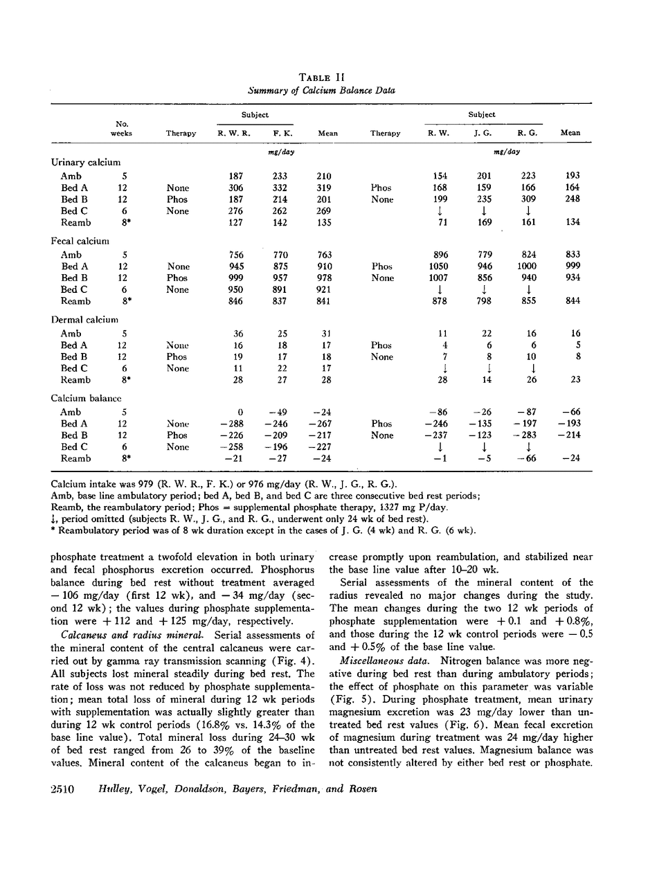 Five healthy young men were studied during 24-30 wk of continuous bed rest. During the first 12 wk of bed rest, untreated subjects increased calcium excretion in the urine by 109 mg/day and in the feces by 147 mg/day. The rate of total body calcium loss was 0.5-0.7% per month. Losses of central calcaneus mineral, assessed by gamma ray transmission scanning, occurred at a tenfold higher rate, whereas the mineral content of the radius did not change. Changes in phosphorus balance resembled the calcium pattern, and increased excretion of nitrogen and hydroxyproline also occurred during bed rest. Upon reambulation, the subjects' calcium balance became positive in 1 month and recovery of their calcaneus mineral was complete within 10-20 wk.