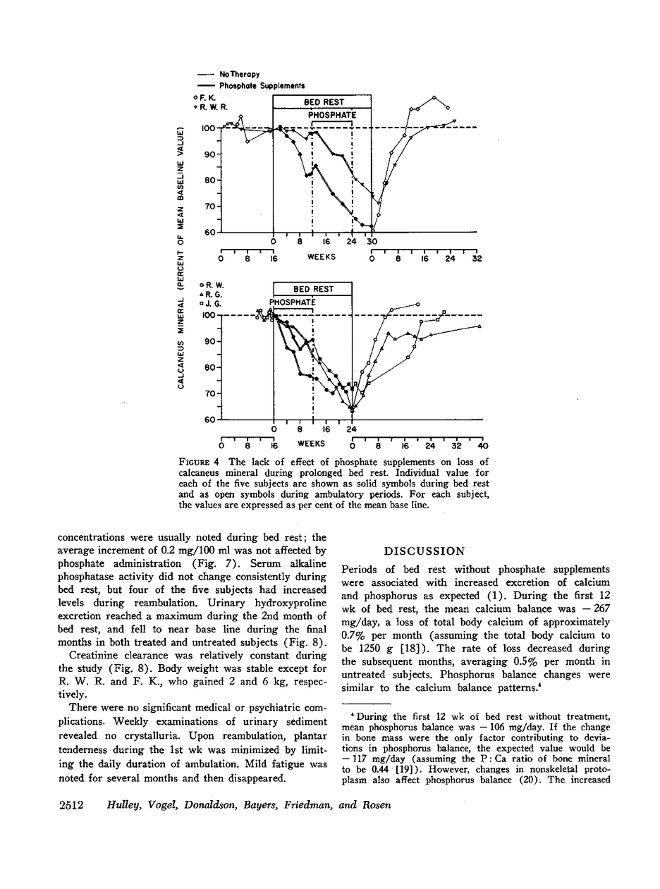 Five healthy young men were studied during 24-30 wk of continuous bed rest. During the first 12 wk of bed rest, untreated subjects increased calcium excretion in the urine by 109 mg/day and in the feces by 147 mg/day. The rate of total body calcium loss was 0.5-0.7% per month. Losses of central calcaneus mineral, assessed by gamma ray transmission scanning, occurred at a tenfold higher rate, whereas the mineral content of the radius did not change. Changes in phosphorus balance resembled the calcium pattern, and increased excretion of nitrogen and hydroxyproline also occurred during bed rest. Upon reambulation, the subjects' calcium balance became positive in 1 month and recovery of their calcaneus mineral was complete within 10-20 wk.
