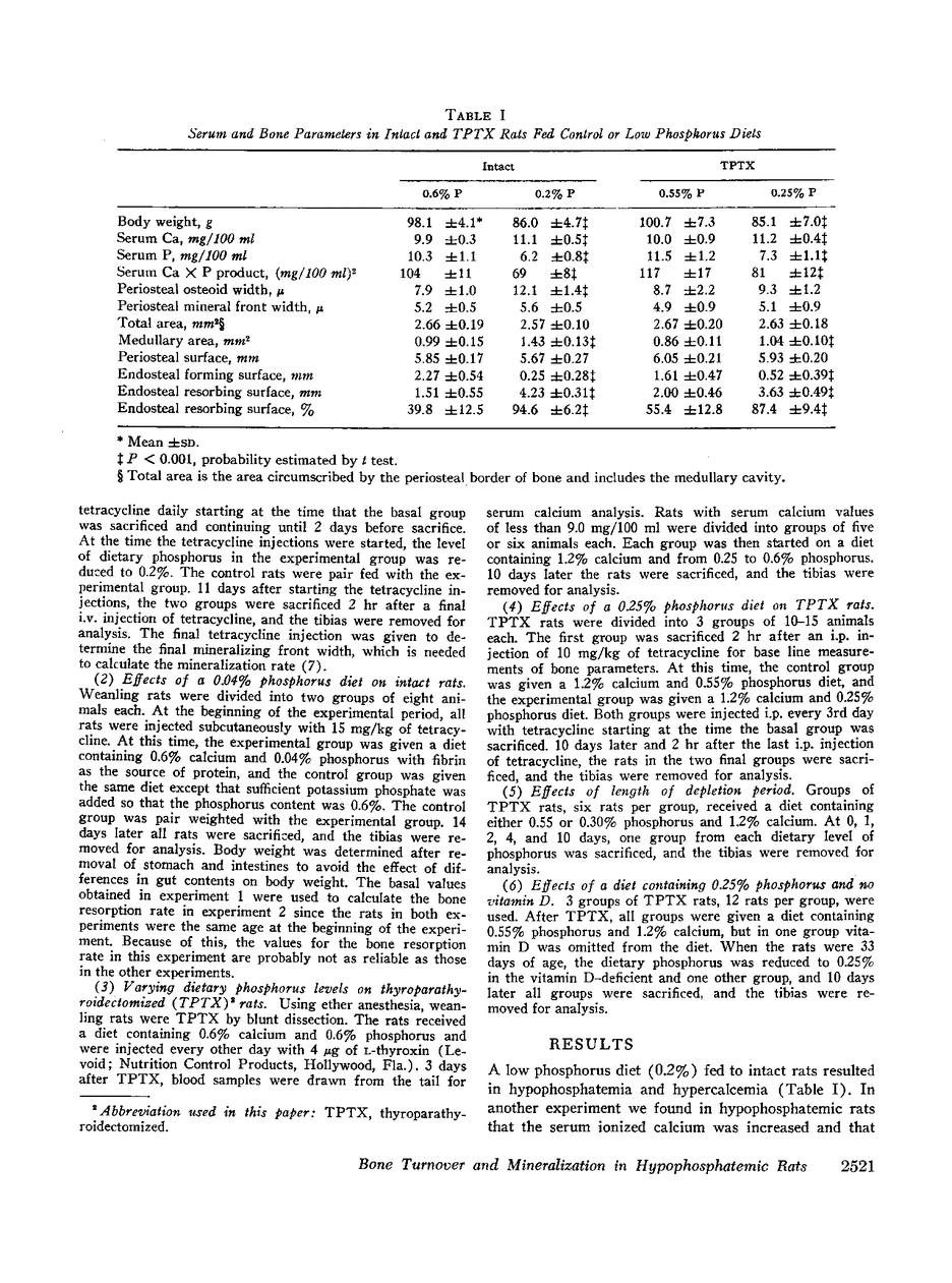Quantitative morphologic methods were used to measure the effects of feeding a low phosphorus diet to intact and thyroparathyroidectomized rats on several processes of bone mineralization and turnover. In severely hypophosphatemic animals, the matrix formation rate was decreased, the osteoid maturation rate was decreased, which indicated a delay in the onset of mineralization, the initial rate of mineralization was decreased, and the endosteal osteoclastic bone resorption rate was increased. In moderately hypophosphatemic animals, there was a substantial increase in bone resorption but no change in formation or in mineralization. The increase in endosteal bone resorption was due to an increase in the linear rate of bone resorption and particularly to an increase in the length of the endosteal resorbing surface. The magnitude of the increase in bone resorption was similar in thyroparathyroidectomized and intact rats indicating that neither parathyroid hormone nor calcitonin is involved in this change. This, together with the finding that there was a strong negative correlation (r = -0.99) between the per cent endosteal resorbing surface and the serum phosphorus, supports the view that the increased resorption was due to hypophosphatemia. This inverse relationship between endosteal resorbing surface and serum phosphorus appeared to hold for values of serum phosphorus above normal. The resorptive response to hypophosphatemia, as previously shown for the resorptive response to excess endogenous parathyroid hormone, was partially inhibited by vitamin D deficiency. Increased resorption occurred at levels of serum phosphorus where no changes were observed in bone formation, mineralization, or growth, suggesting that this resorptive response functions as a homeostatic mechanism to maintain serum and intracellular phosphorus concentrations.