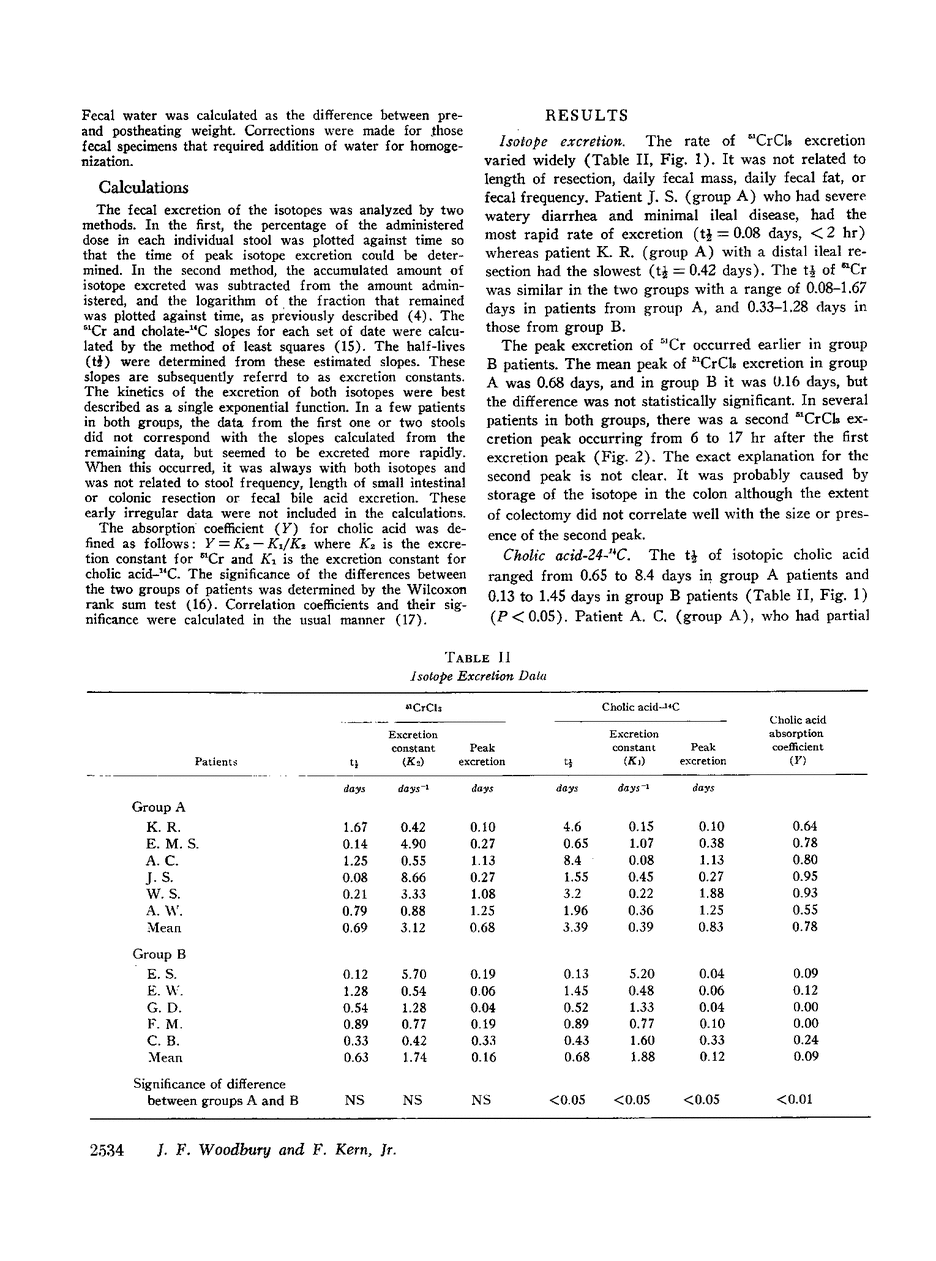 The fecal elimination and enterohepatic circulation of bile acid was studied in 11 patients. 10 patients with varying degrees of ileal disease or resection and 1 patient with pancreatic insufficiency and no ileal disease. A new technique was employed which involved the nearly simultaneous administration of cholic acid-14C and a nonabsorbable marker. 51CrCl3. Each individual stool specimen was collected for 36-96 hr and analyzed separately. Assay of the radioactivity of each isotope allowed the accurate determination of an excretion rate for both cholic acid and 51Cr. The difference between these rates was used to calculate an absorption coefficient for cholic acid. In addition, bile acid concentration measured by the steroid dehydrogenase technique, and the water content of each stool was determined.
