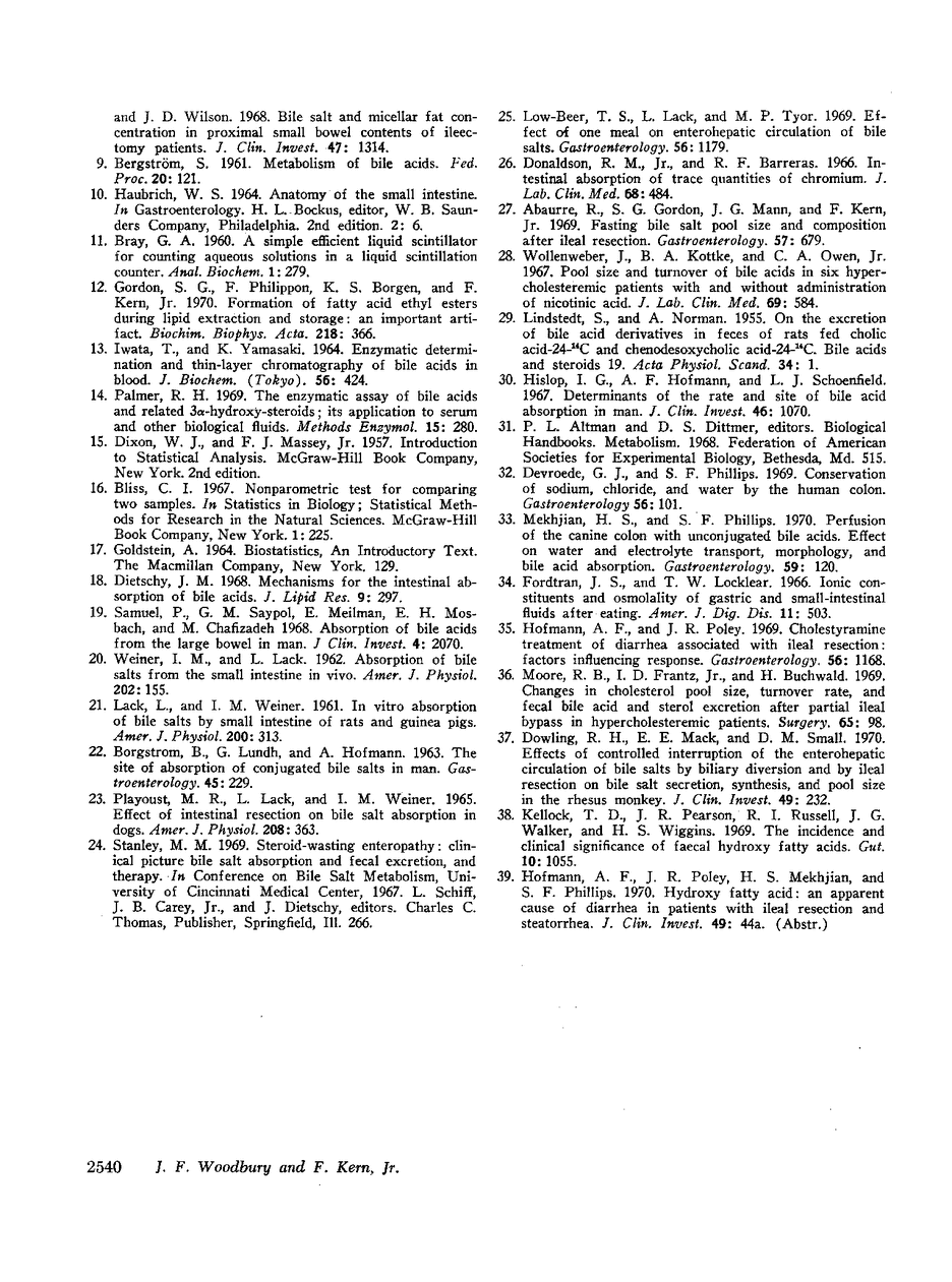 The fecal elimination and enterohepatic circulation of bile acid was studied in 11 patients. 10 patients with varying degrees of ileal disease or resection and 1 patient with pancreatic insufficiency and no ileal disease. A new technique was employed which involved the nearly simultaneous administration of cholic acid-14C and a nonabsorbable marker. 51CrCl3. Each individual stool specimen was collected for 36-96 hr and analyzed separately. Assay of the radioactivity of each isotope allowed the accurate determination of an excretion rate for both cholic acid and 51Cr. The difference between these rates was used to calculate an absorption coefficient for cholic acid. In addition, bile acid concentration measured by the steroid dehydrogenase technique, and the water content of each stool was determined.