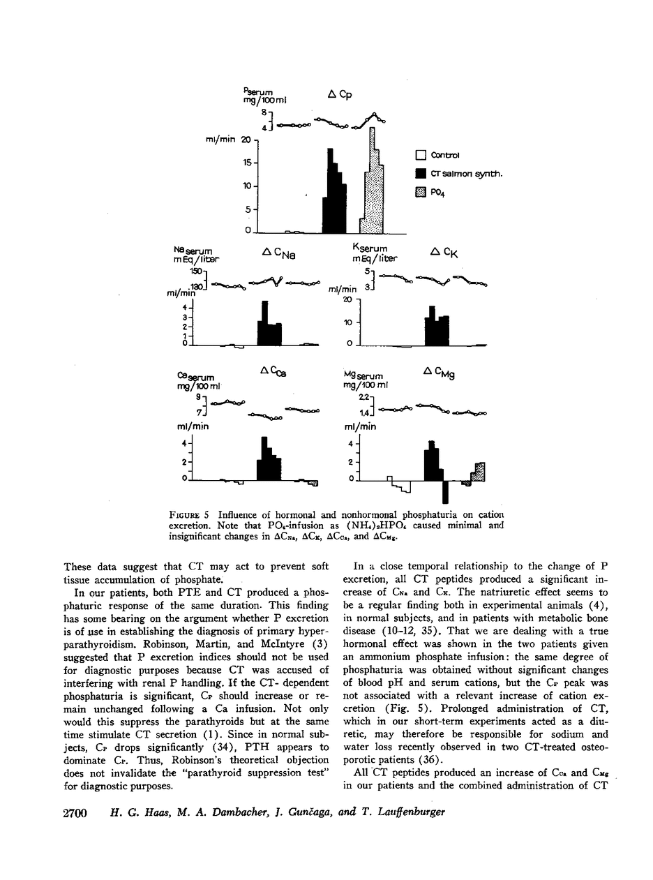 To clarify the controversial renal action of calcitonin (CT) and a possible interrelationship between CT and parathyroid hormone, eight patients with untreated surgical hypoparathyroidism were studied. Various calcitonins, i.e. extracted porcine, synthetic porcine, synthetic human, and synthetic salmon CT in doses of 150 Medical Research Council U or 1.5 mg were infused over a 3 hr period. Subsequently, six of the same subjects received 500 USP U parathyroid extract (PTE) (Eli Lilly & Co., Indianapolis, Ind.) in 3 hr and later a combination of CT and PTE. In addition, two patients were given an infusion of ammonium phosphate with the aim of producting a phosphaturia of comparable degree as seen after CT and PTE, thus differentiating hormonal from nonhormonal influences on cation excretion. A protocol of serial clearance (C) studies using the patients as their own controls was followed. Serum and urinary inorganic phosphate (P), calcium (Ca), magnesium (Mg), sodium (Na), potassium (K), and creatinine (Cr) were determined and the clearance values calculated.