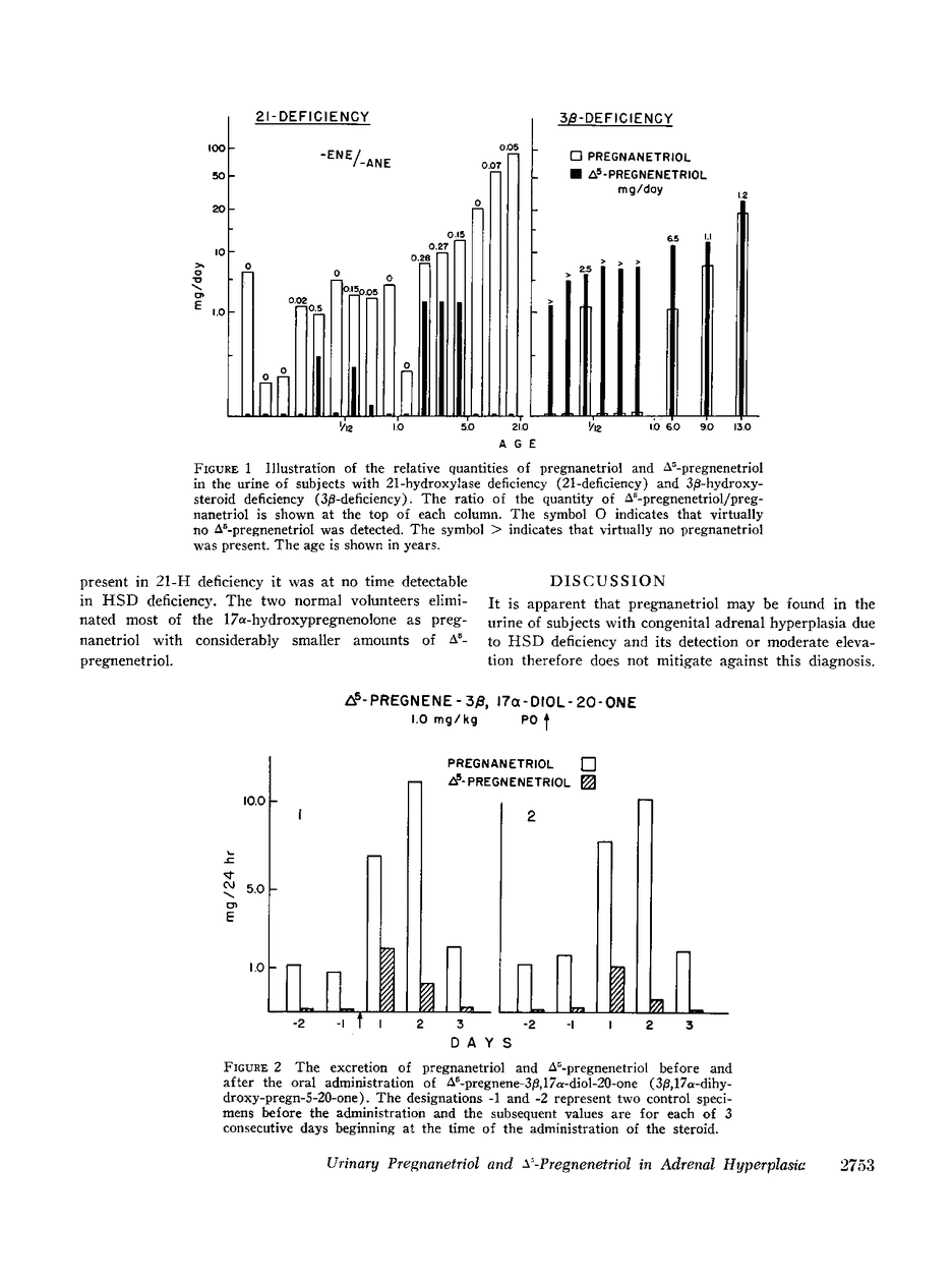 Although congenital adrenal hyperplasia due to 3β-hydroxysteroid dehydrogenase deficiency generally reveals a predominance of Δ5-3β-hydroxysteroids, on occasion substantial quantities of pregnanetriol have been found as well. It appears that the latter steroid more often occurs in the subjects who have survived beyond infancy. The use of the measurement of pregnanetriol alone may therefore not be relied upon as a sole determinant of the specific form of defective steroidal biogenesis. It is more characteristic of the 21-hydroxylase deficiency. However when both Δ5-pregnenetriol and pregnanetriol are measured the ratio of the former to the latter is always considerably below 1.0 in 21-hydroxylase deficiency and always above 1.0 in 3β-hydroxysteroid dehydrogenase. Furthermore, 11-ketopregnanetriol has been found only in the urine of subjects with the 21-hydroxylase deficiency. Thus, these two forms of defective steroidal biogenesis may be distinguished by the measurement of these three urinary steroidal metabolites.