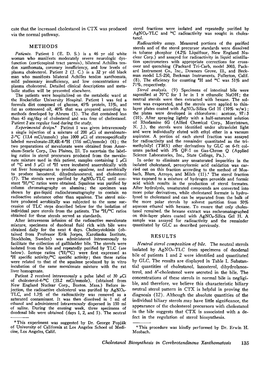 Cerebrotendinous Xanthomatosis is a rare, inherited disease characterized by an extraordinary accumulation of cholestanol in all tissues, xanthomatous deposits in the brain, lungs, and Achilles tendons, premature atherosclerosis, and low plasma cholesterol concentrations. In two patients with the disease, the biosynthesis of cholestanol was examined by different techniques. After cholesterol-4-14C was injected intravenously into one patient, cholestanol and cholesterol isolated from the bile on 3 different days over the ensuing week contained significant radioactivity. The specific radioactivity-time curves for cholesterol-14C and cholestanol-14C suggested a precursor product relationship and provided additional evidence for the transformation of cholesterol into cholestanol. The second patient received intravenously a mixture of mevalonate-2-14C and stereospecifically labeled mevalonate-3R,4R-3H. Again cholesterol and cholestanol were isolated from the bile, and the 3H/14C ratio in both sterols was almost the same. This experiment again demonstrated that the biosynthetic path of cholestanol proceeded through cholesterol and not directly from earlier 5α-H-saturated precursors. These two independent lines of evidence indicate that the extraordinary deposition of cholestanol in Cerebrotendinous Xanthomatosis arises from cholesterol presumably through the accentuation of the normal biosynthetic pathway.