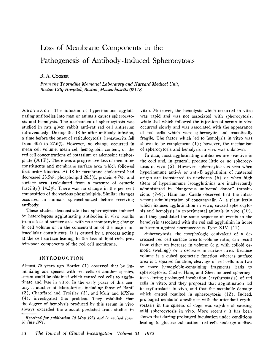 The infusion of hyperimmune agglutinating antibodies into man or animals causes spherocytosis and hemolysis. The mechanism of spherocytosis was studied in rats given rabbit anti-rat red cell antiserum intravenously. During the 18 hr after antibody infusion, a time before the onset of reticulocytosis, hematocrits fell from 40.6 to 27.6%. However, no change occurred in mean cell volume, mean cell hemoglobin content, or the red cell concentrations of potassium or adenosine triphosphate (ATP). There was a progressive loss of membrane constituents and membrane surface area which followed first order kinetics. At 18 hr membrane cholesterol had decreased 23.5%, phospholipid 26.3%, protein 4.7%, and surface area (calculated from a measure of osmotic fragility) 14.2%. There was no change in the per cent composition of the various phospholipids. Similar changes occurred in animals splenectomized before receiving antibody.