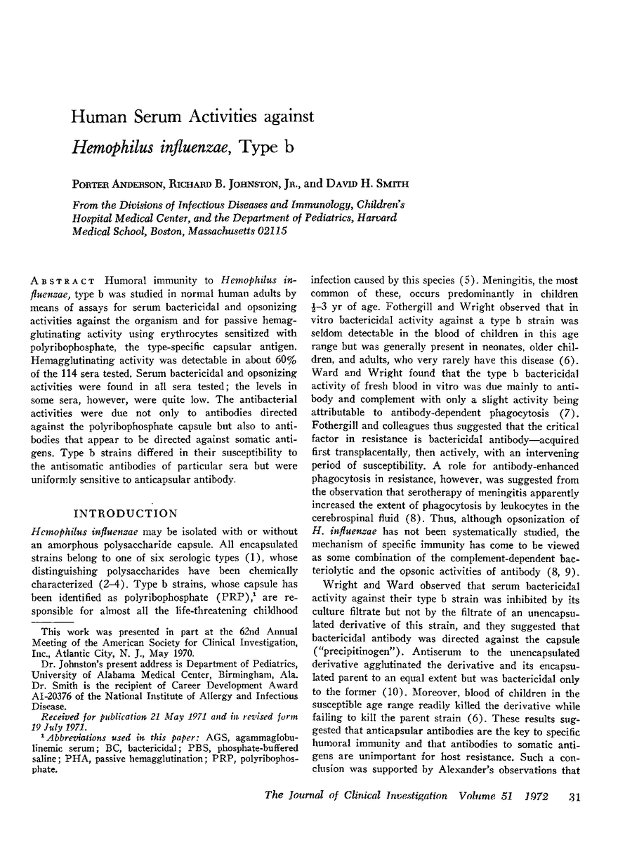 Humoral immunity to Hemophilus influenzae, type b was studied in normal human adults by means of assays for serum bactericidal and opsonizing activities against the organism and for passive hemagglutinating activity using erythrocytes sensitized with polyribophosphate, the type-specific capsular antigen. Hemagglutinating activity was detectable in about 60% of the 114 sera tested. Serum bactericidal and opsonizing activities were found in all sera tested; the levels in some sera, however, were quite low. The antibacterial activities were due not only to antibodies directed against the polyribophosphate capsule but also to antibodies that appear to be directed against somatic antigens. Type b strains differed in their susceptibility to the antisomatic antibodies of particular sera but were uniformly sensitive to anticapsular antibody.