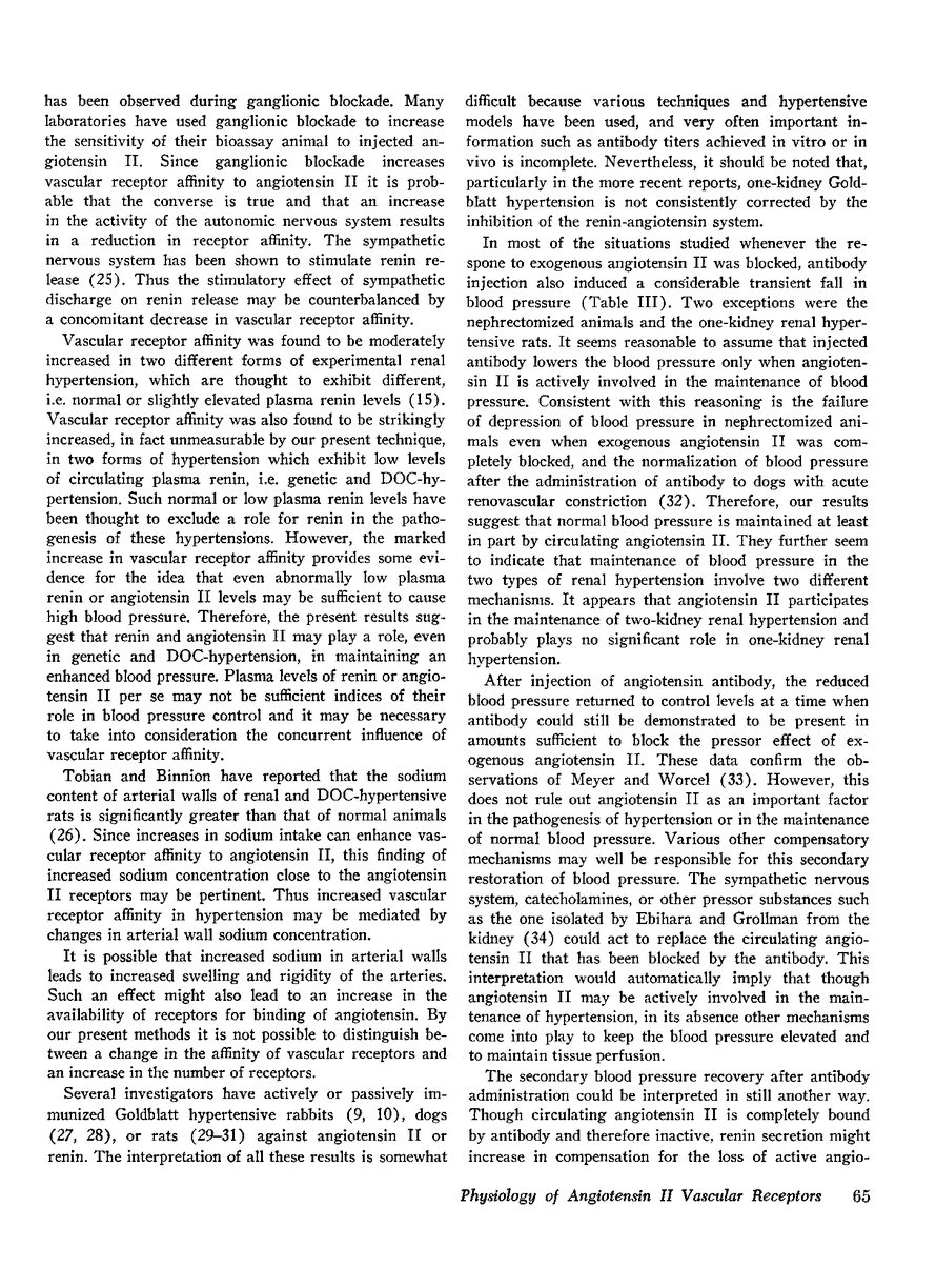 During intravenous administration of varying doses of angiotensin II antibody to anesthetized rats, apparently specific vascular receptors were characterized. These receptors compete with administered antibody to bind circulating angiotensin. This competitive phenomenon was used to evaluate the affinity of these receptors for angiotensin. Apparent vascular receptor affinity was defined by the amount of antibody required to block the blood pressure response to exogenous angiotensin. It was found that this receptor affinity varies directly with sodium intake so that the amount of antibody required to block was eightfold greater in normal animals on a high sodium intake, as compared with those on a low sodium intake. Sodium dependence of receptors was also demonstrated in nephrectomized animals, in desoxycorticosterone (DOC)-treated rats, and in chronic renal hypertension. Thus the observed changes in receptor affinity were usually inversely related to measured endogenous angiotensin II levels. Ganglionic blockade increased antibody requirement eightfold. All of these changes were consistent, with no overlap observed in response of individual animals from different groups. These results may explain the variation in pressor activity of angiotensin associated with changes in salt balance and ganglionic blockade.