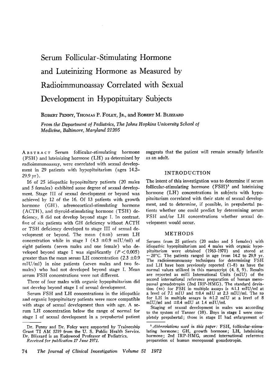 Serum follicular-stimulating hormone (FSH) and luteinizing hormone (LH) as determined by radioimmunoassay, were correlated with sexual development in 29 patients with hypopituitarism (ages 14.2-29.9 yr).