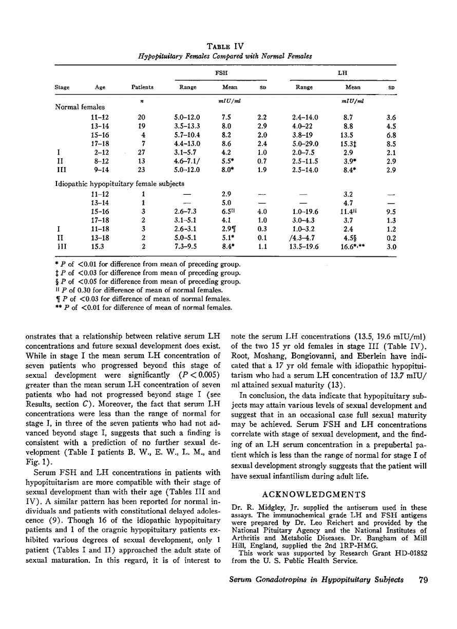 Serum follicular-stimulating hormone (FSH) and luteinizing hormone (LH) as determined by radioimmunoassay, were correlated with sexual development in 29 patients with hypopituitarism (ages 14.2-29.9 yr).